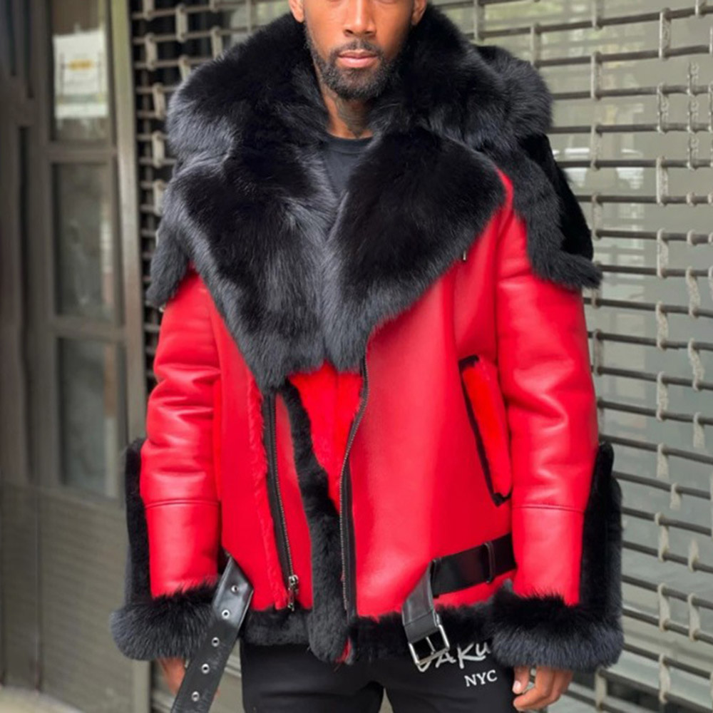 Veste d'hiver en cuir pour hommes, épais, col en fourrure de velours, fermeture éclair à capuche, bloc de couleur, Patchwork, mode veste en cuir rouge pour hommes