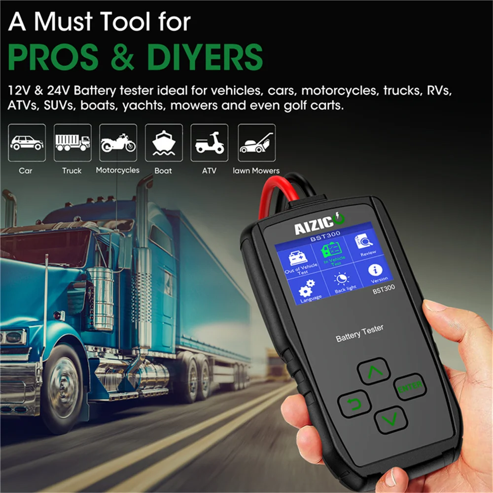 12V и 24V автомобиль Батарея Tester➤BST300 автомобильный тестер батареи работает на всех 12 вольт и 24 вольт батарей с 100 до 2000 CCA, таких как регулярные затоплены, AGM плоские пластины, AGM спираль, гель и глубокий цикл батареи для транспортных средств, автомобили, мотоциклы, грузовики, RVs, квадроциклы, внедорожники, лодки, яхты, косилки и даже тележки для гольфа