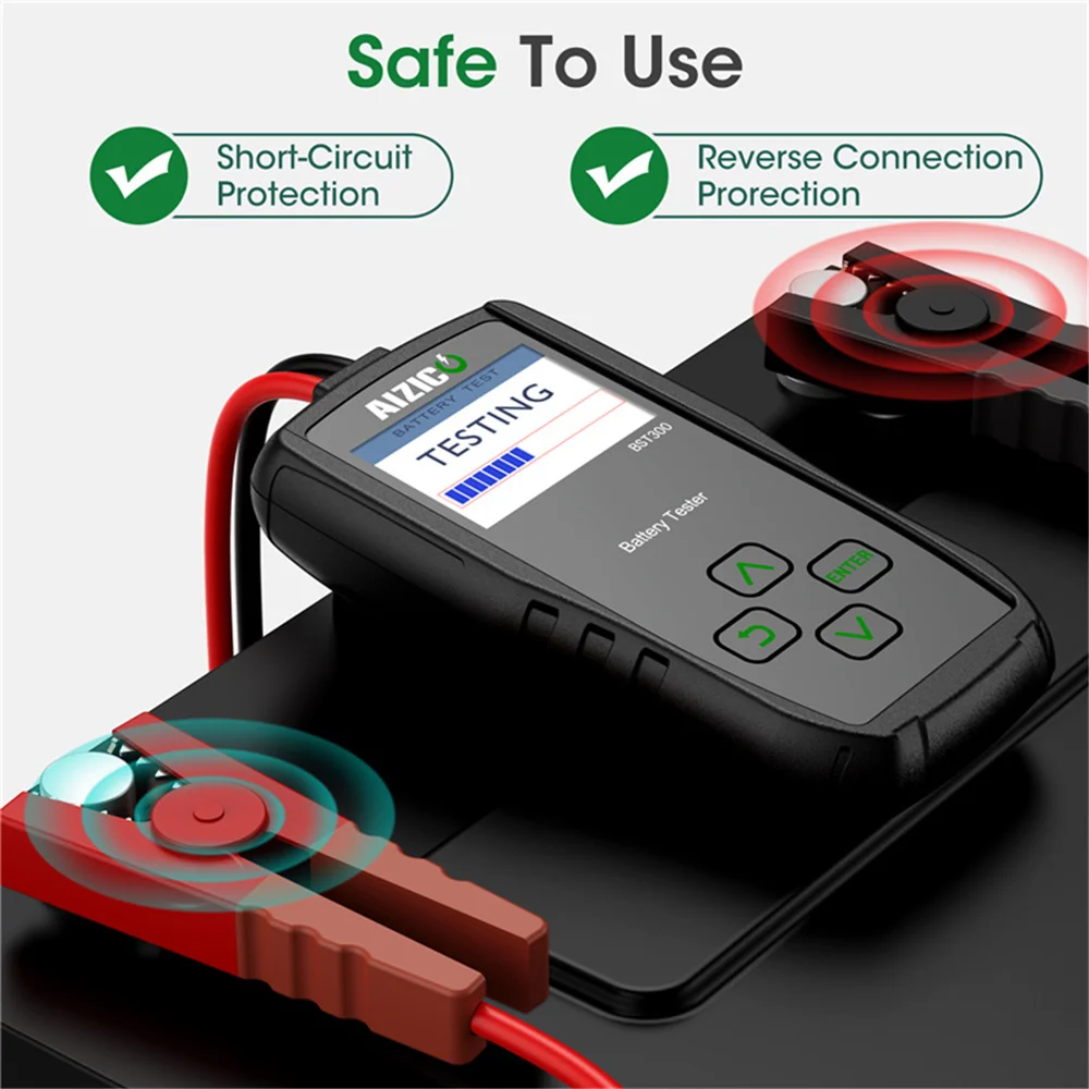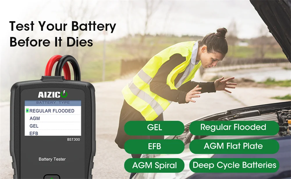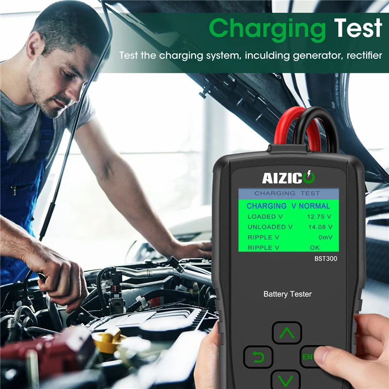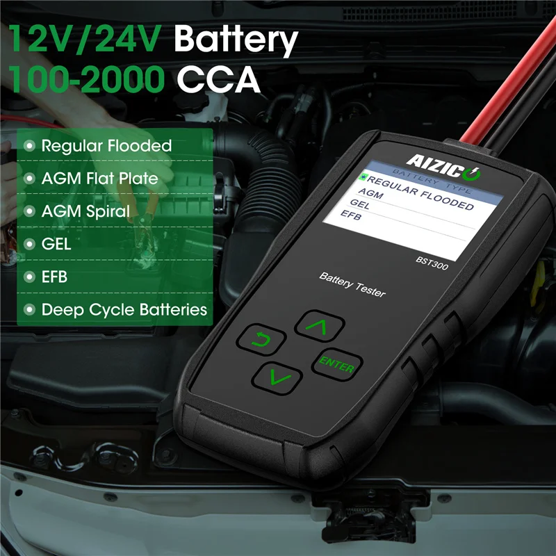 AIZICO BST300 тестер автомобильного аккумулятора, работает на всех 12 вольт и 24 вольт батарей с 100 до 2000 CCA, таких как регулярные затоплены, AGM плоская пластина, AGM спираль, гелевые и глубокие батареи для транспортных средств, автомобилей, мотоциклов, грузовиков, RVs, квадроциклов, внедорожников, лодок, яхт, Косилки и даже тележки для гольфа. Проверьте свой аккумулятор до того, как он умрет.