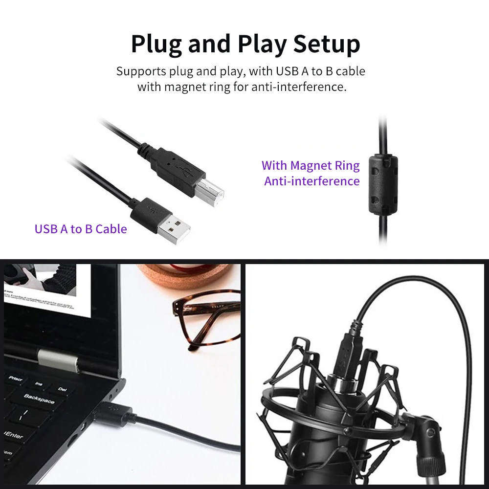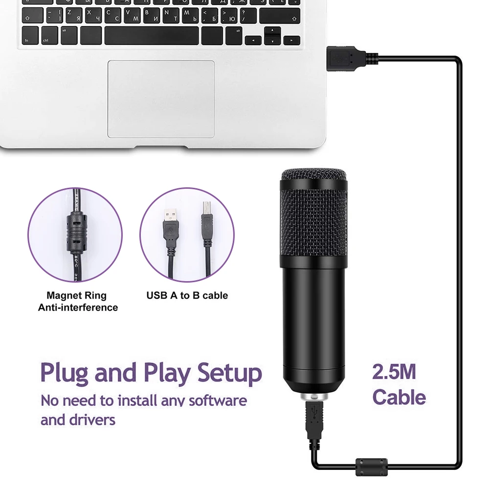 Микрофон может быть легко подключен к компьютеру, без программного обеспечения и драйверов, необходимых через usb-кабель с магнитным кольцом, который помогает уменьшить помехи, для более удобного сбора голоса при подкачивании, вещании, записи, игр, потоковой передачи, общения и облаков.