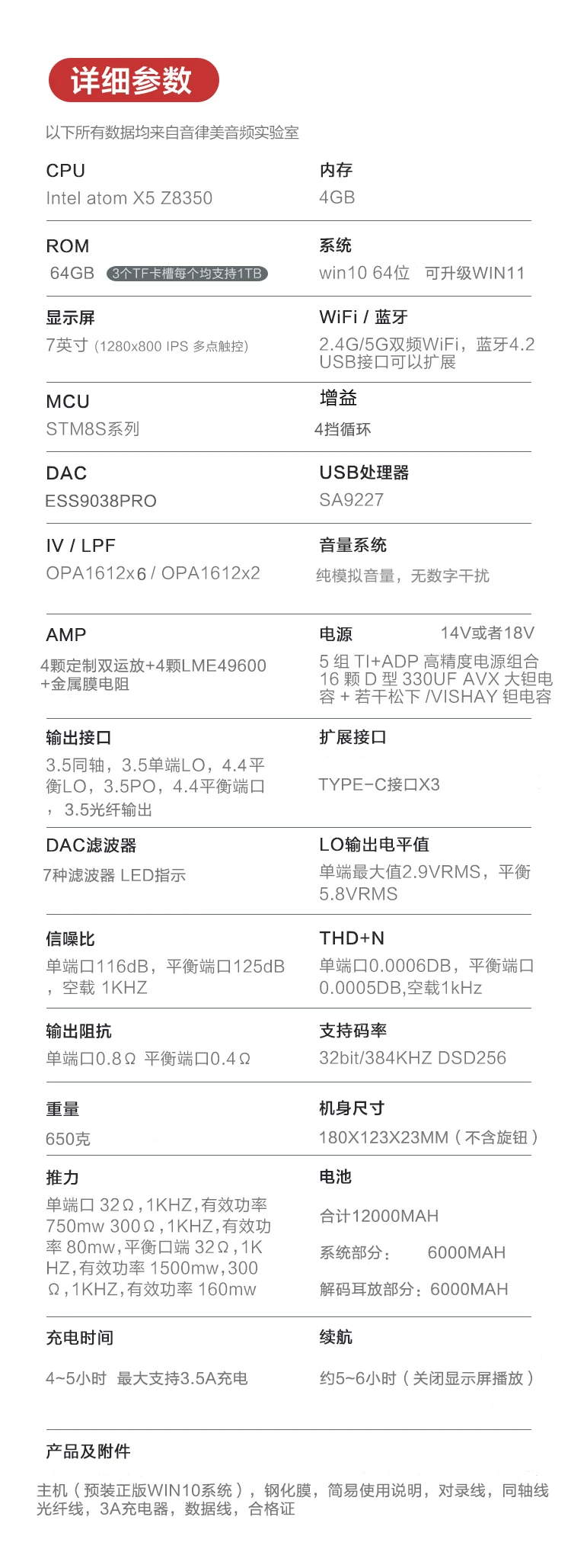 ** W1S-это оптимизированная и модернизированная версия W1, с использованием декодирования ESS9038pro (такой же, как W1 V12 пользовательская машинная Архитектура), 6 OPA1612 как IV конверсионный фильтр, пользовательский операционный усилитель как amp OP, LME49600 в качестве буфера, Звук естественный, само собой разумеется, с большой тягой. Высокое качество, сохраняя отдельный блок питания W1, встроенные две литиевые батареи 6000 мАч для питания системы windows и декодирования усилителя соответственно, так что звук чище и фон темнее. По сравнению с W1, есть несколько различий: 1. Сменный аккумулятор отменен. Структура, но сохраняет отдельный источник питания, то есть 2 батареи встроены, и корпус тоньше. 2. Базовая контактная конструкция отменена, и ее тяга достаточно велика, что в 2-3 раза больше, чем у W1. 3. Отмените вторичный экран, переключитесь на аналоговый потенциометр, установите усиление на 4 шестерни, и можно адаптировать разъем и большие наушники. 4. Все порты USB заменены на порты C. 5. Добавить 4,4 сбалансированный выход LO. 6. Увеличение объема производства волокна. 7. Добавьте физическую кнопку с одним нажатием кнопки блокировки экрана.