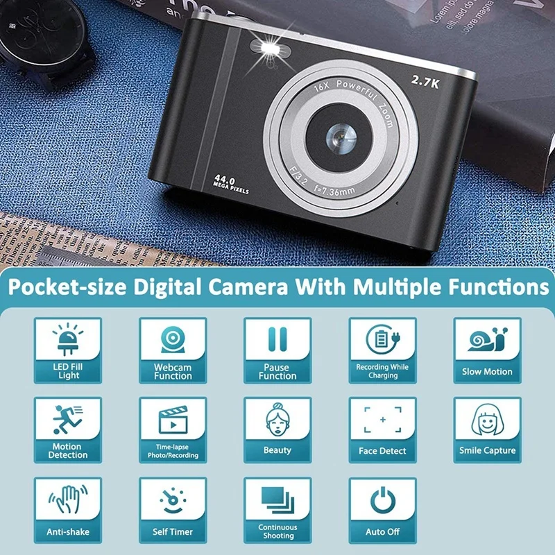 Vlogging 2.7 K HD 44mp camera, 16x digital zoom, compact pocket camera with fill light, suitable for teenagers and children