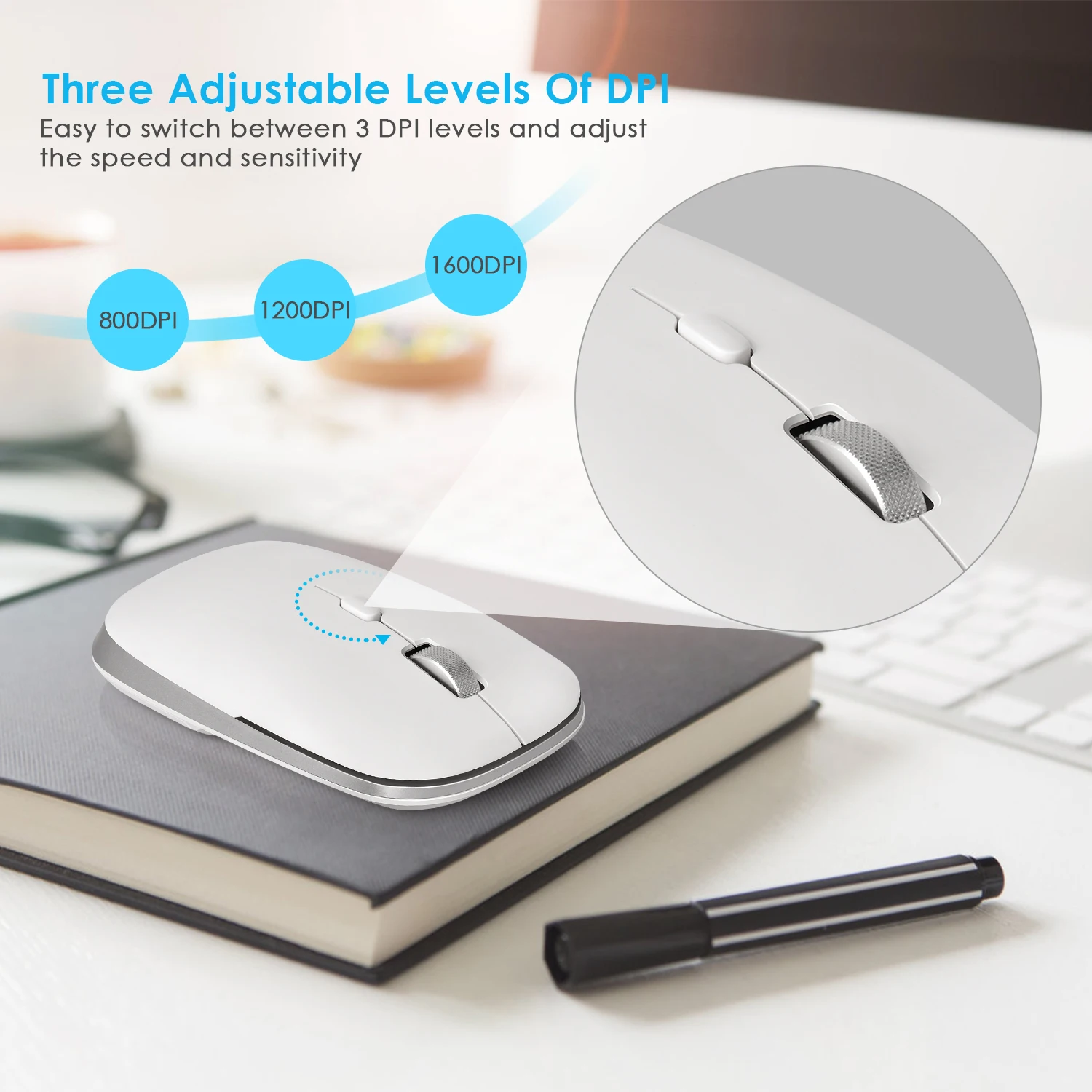 【 3 Регулируемый DPI】800,1200,1600 DPI, легко изменить чувствительность курсора в зависимости от вашей деятельности. Компьютерная мышь поставляется с нано-приемником (хранится в задней части беспроводной мыши с магнитной силой). Нет необходимости в драйвере, и вы можете подключать и воспроизводить беспроводную мышь для ноутбука напрямую.