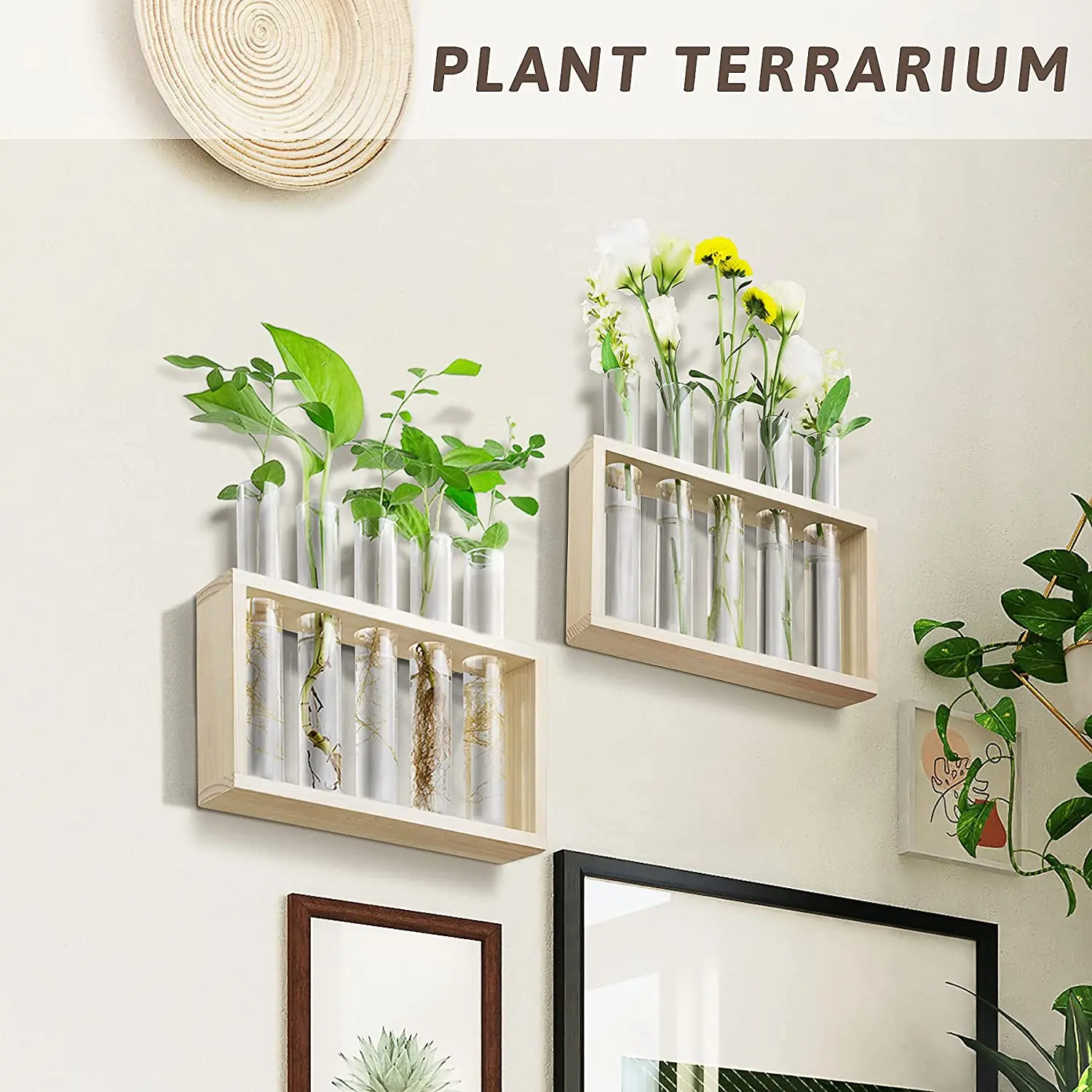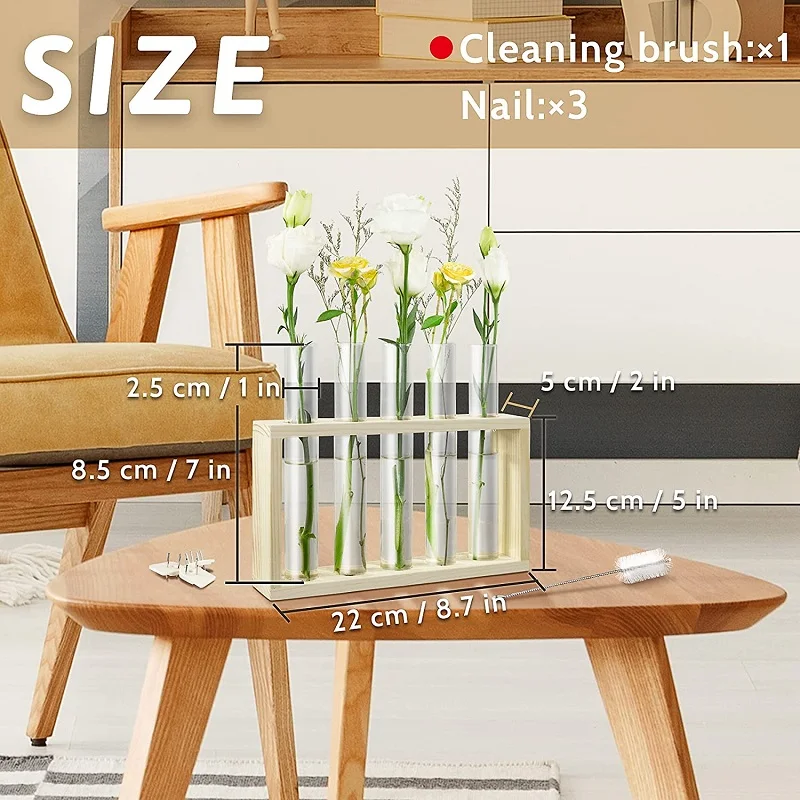 Высококачественный стеклянный контейнер для растений: рамка для растений имеет естественную деревянную раму, которая является стабильной и практичной. 5 чистые пробирки изготовлены из термостойкого, прочного и съемного боросиликатного стекла. Вы можете легко заменить воду и растения в любое время.