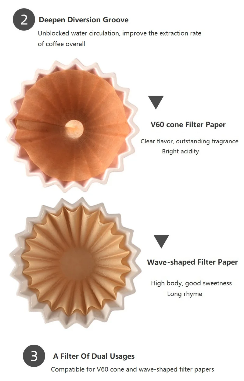 Элегантный дизайн: вырезаны из фарфора с цветочной формой. Уникальная кофейная капельница позволяет вам заваривать кофе, выглядит элегантно и профессионально. Подходит для 1-2 стаканчиков фильтровальной бумаги V60. Подходит как для коммерческого, так и для домашнего использования, идеальный подарок для любого кофе.
