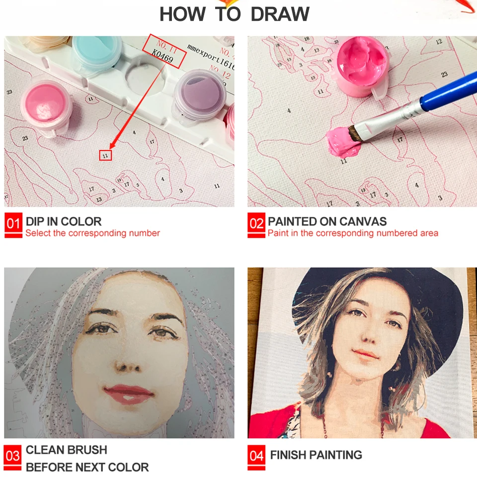 2. volgens het aantal van de verf, gebruik de borstel om uitstrijkje de verf op de overeenkomstige genummerde gebied van de canvas.