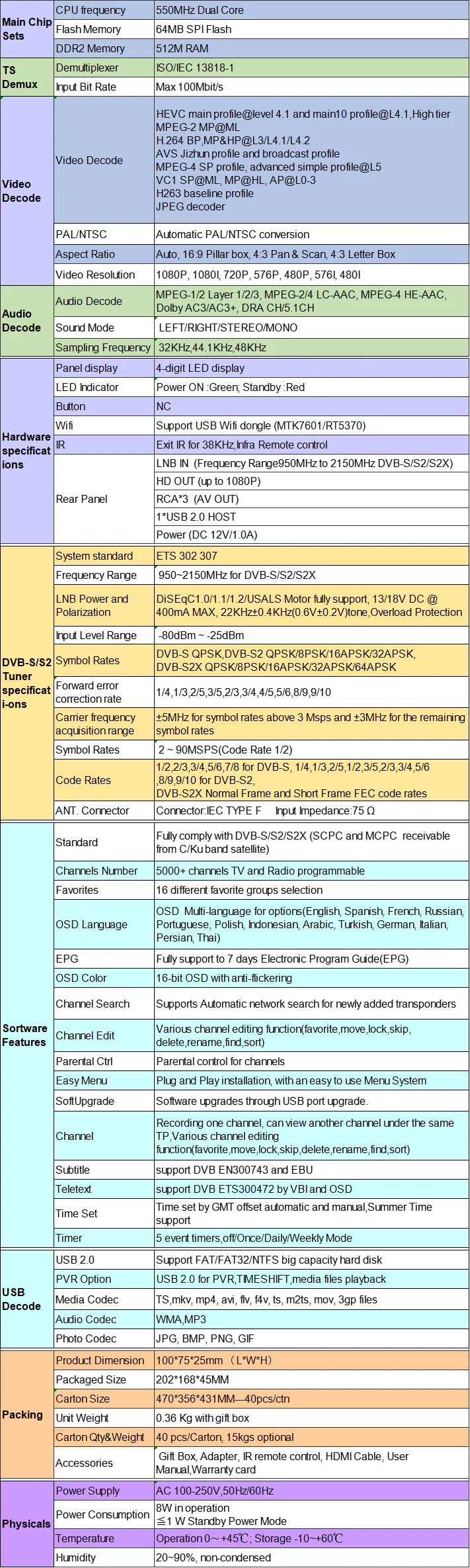 1. Поддержка DVB-S/S2/S2X, AVS +,VCM/ACM/multi-stream/T2MI