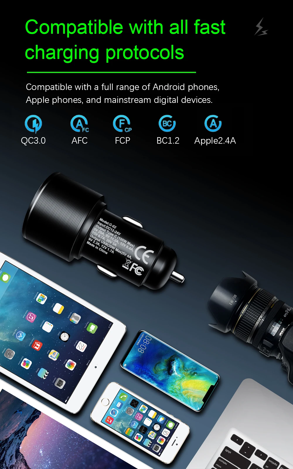 Автомобильное зарядное устройство имеет встроенный чип защиты зарядки, чтобы предотвратить перезарядку устройства и предотвратить короткое замыкание зарядки. И может обеспечить высокую эффективность преобразования тока.