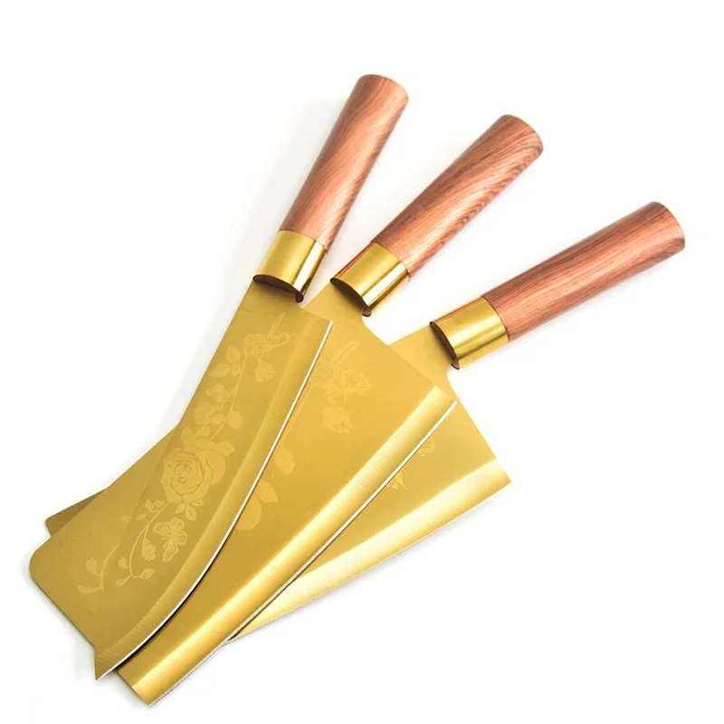 2.Уникальный внешний вид и дизайн: золотое очаровательное лезвие, сочетающее ручку с текстурой коричневого дерева, придает ножам уникальную красоту.