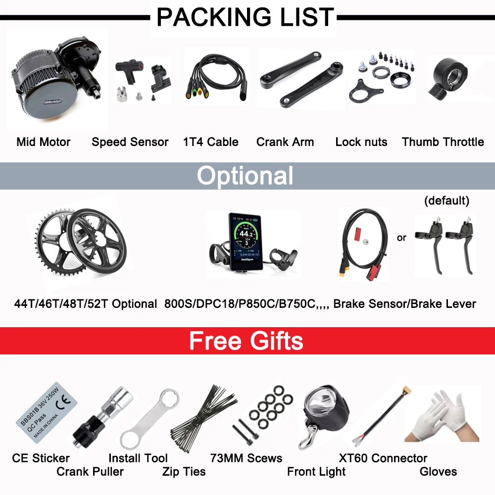 1 шт., 6 в, передний светильник + 1 шт., Gloves1 + 1 шт., ключ для установки инструмента + 1 шт., съемный инструмент с рукояткой + 1 шт., XT60 порт, соединительный кабель для аккумулятора + 1 комплект * Установите аксессуары для нижней части 73 мм кронштейн + 4 шт 36V 250W наклейки + Кабельные стяжки + Руководство пользователя
