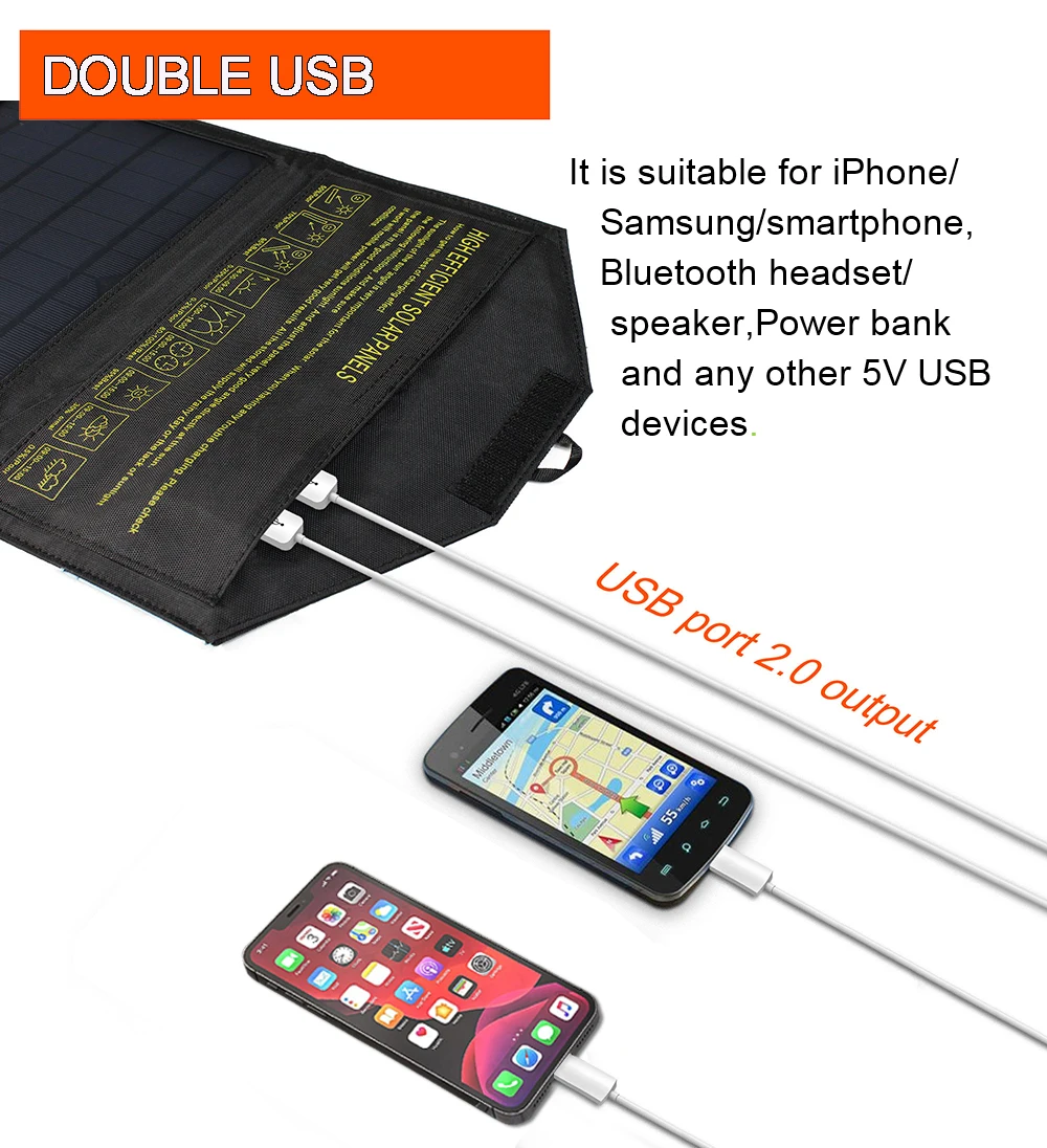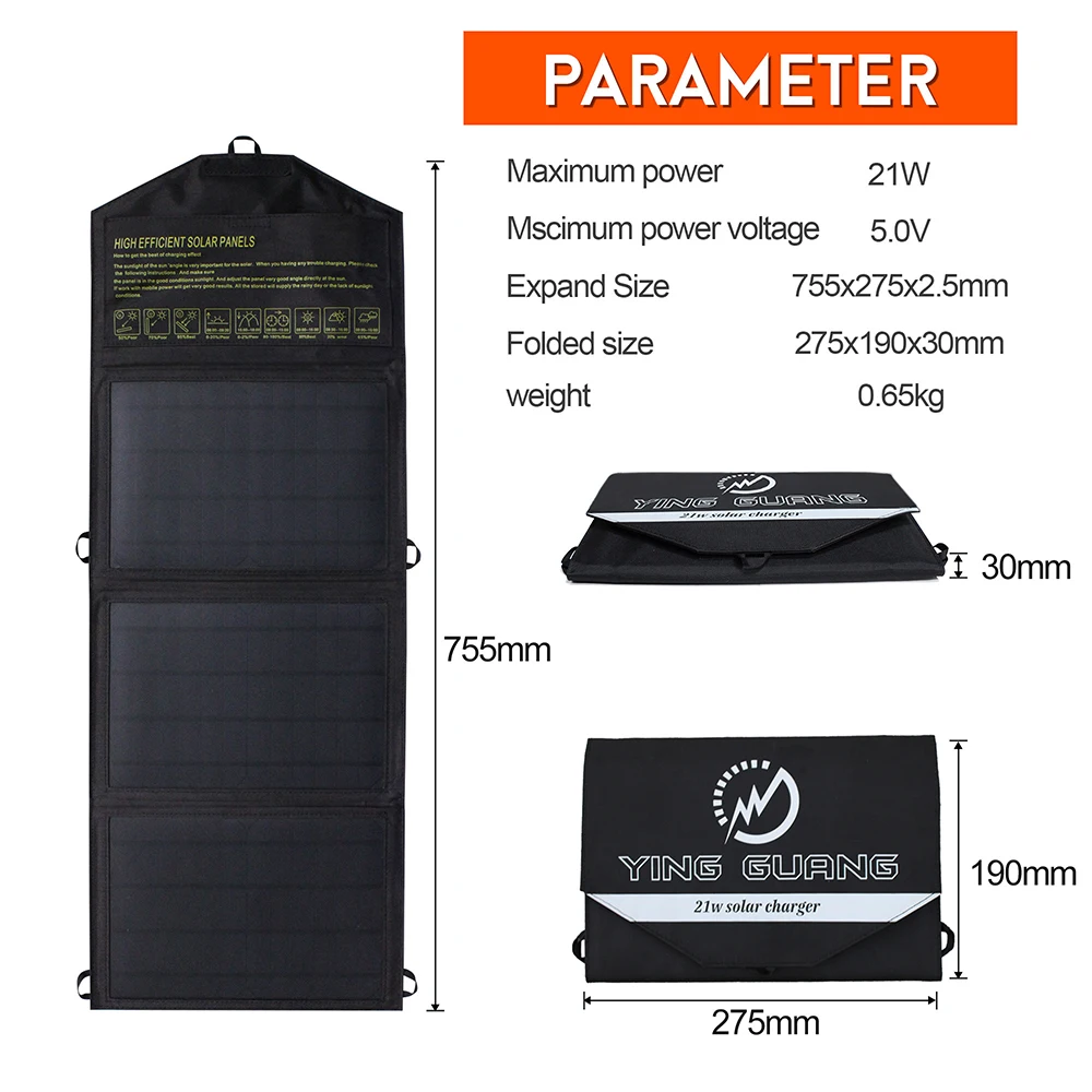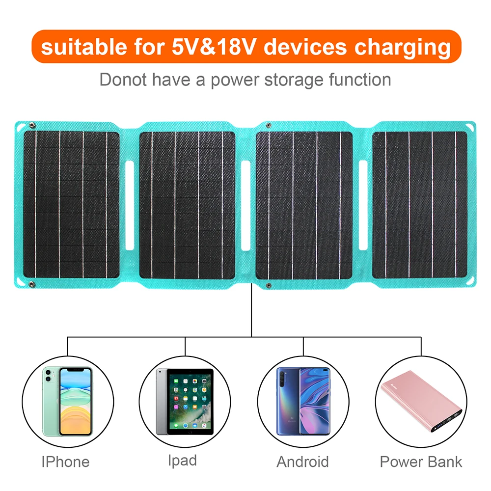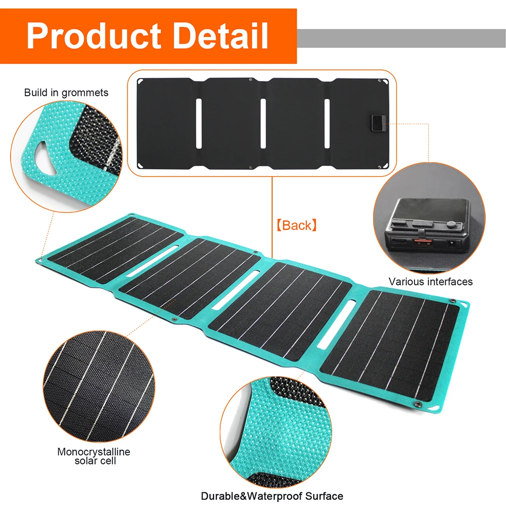 Портативная Складная солнечная панель мощностью 28 Вт изготовлена из новейшего усовершенствованного монокристаллического кремния высокой плотности, который меньше по размеру и имеет более высокий коэффициент конверсии.