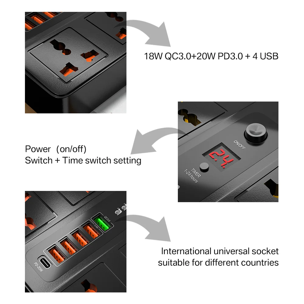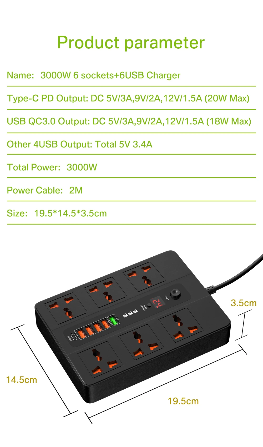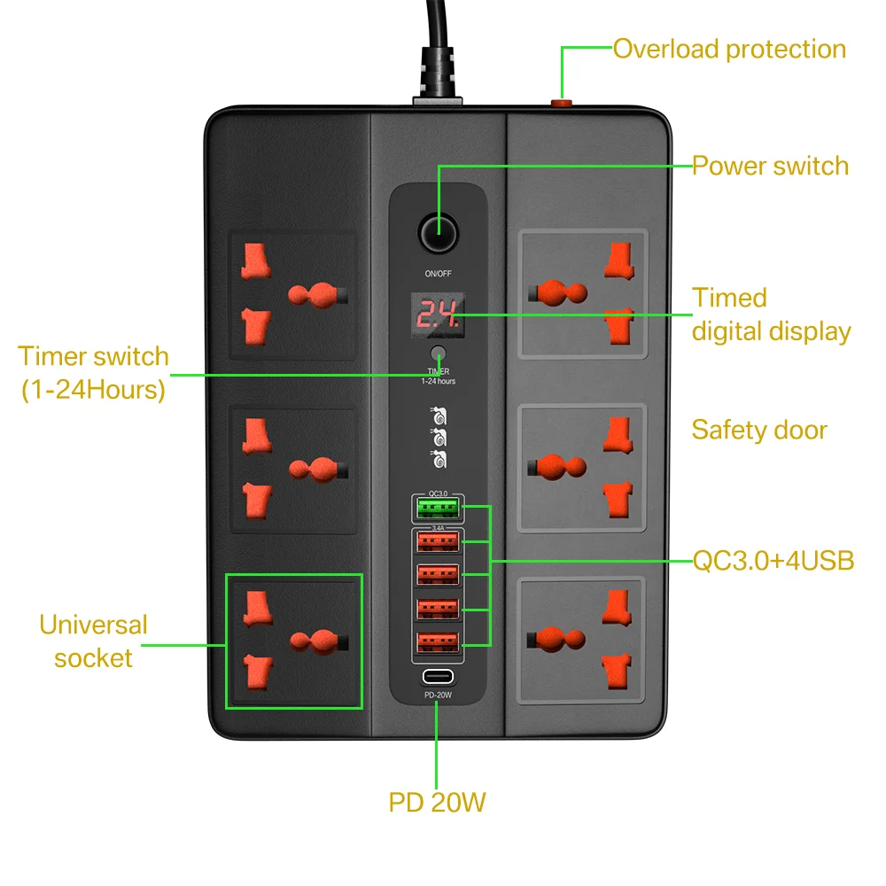 Много точек полосы-6 универсальных розеток переменного тока, мульти 5 В/2,4 А (всего 3,4 а/18 Вт), 1 порт QC3.0, 1 порт USBC PD 20 Вт, быстрая и эффективная зарядка.