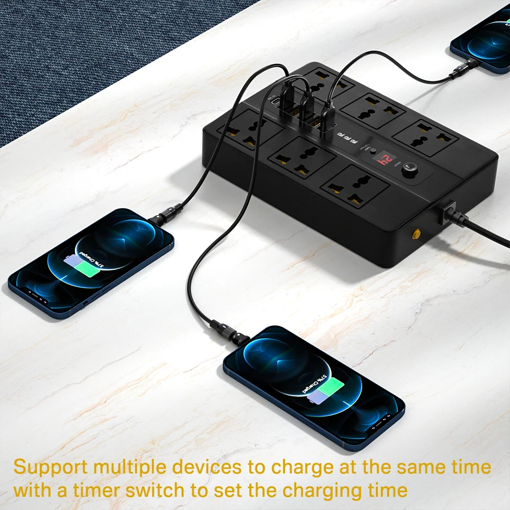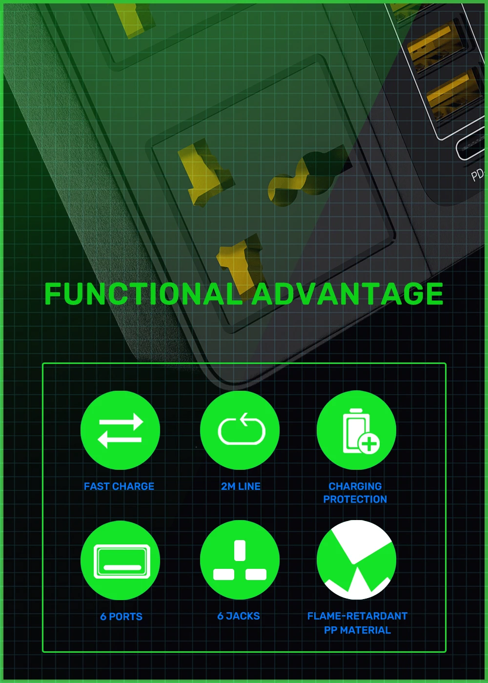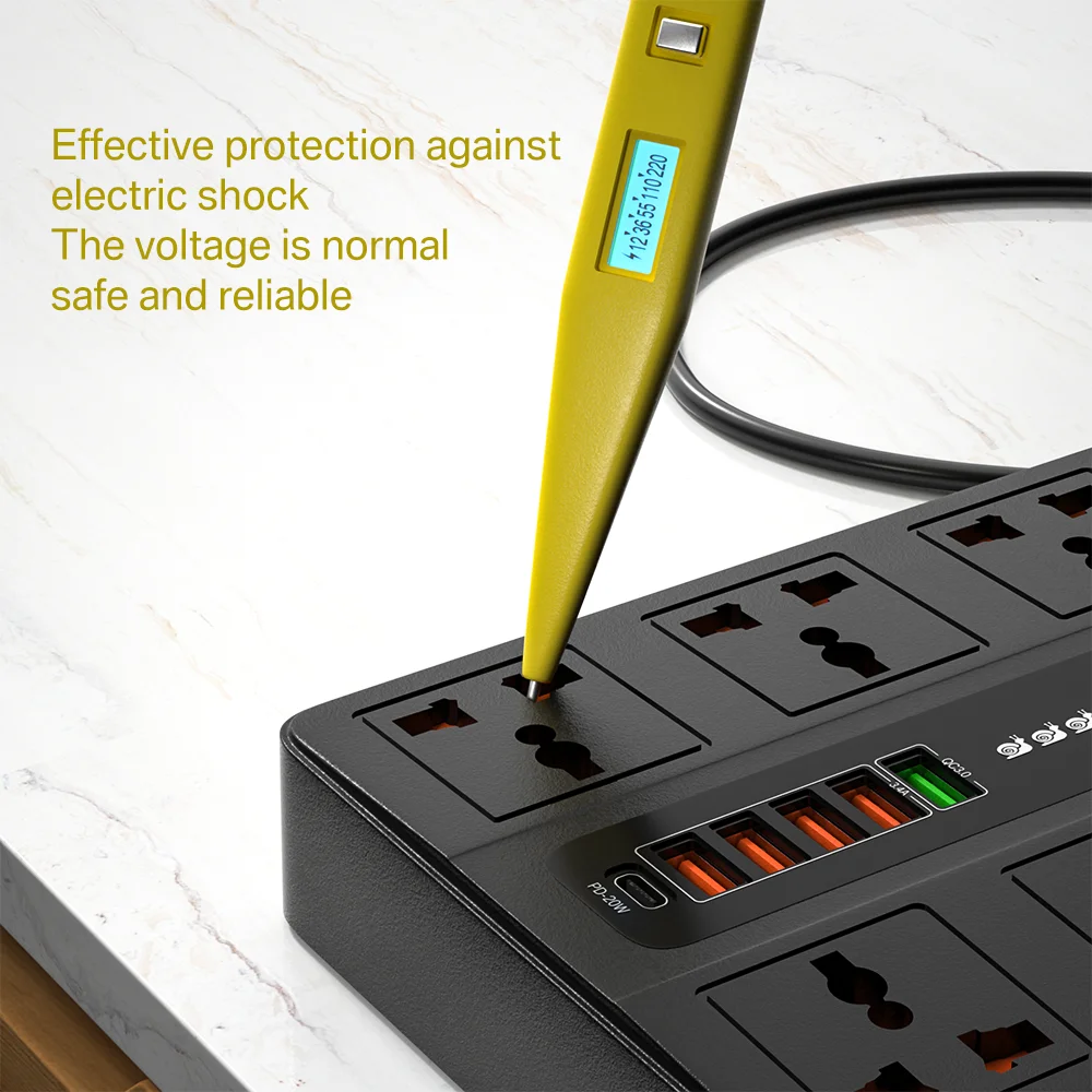 Много точек полосы-6 универсальных розеток переменного тока, мульти 5 В/2,4 А (всего 3,4 а/18 Вт), 1 порт QC3.0, 1 порт USBC PD 20 Вт, быстрая и эффективная зарядка.