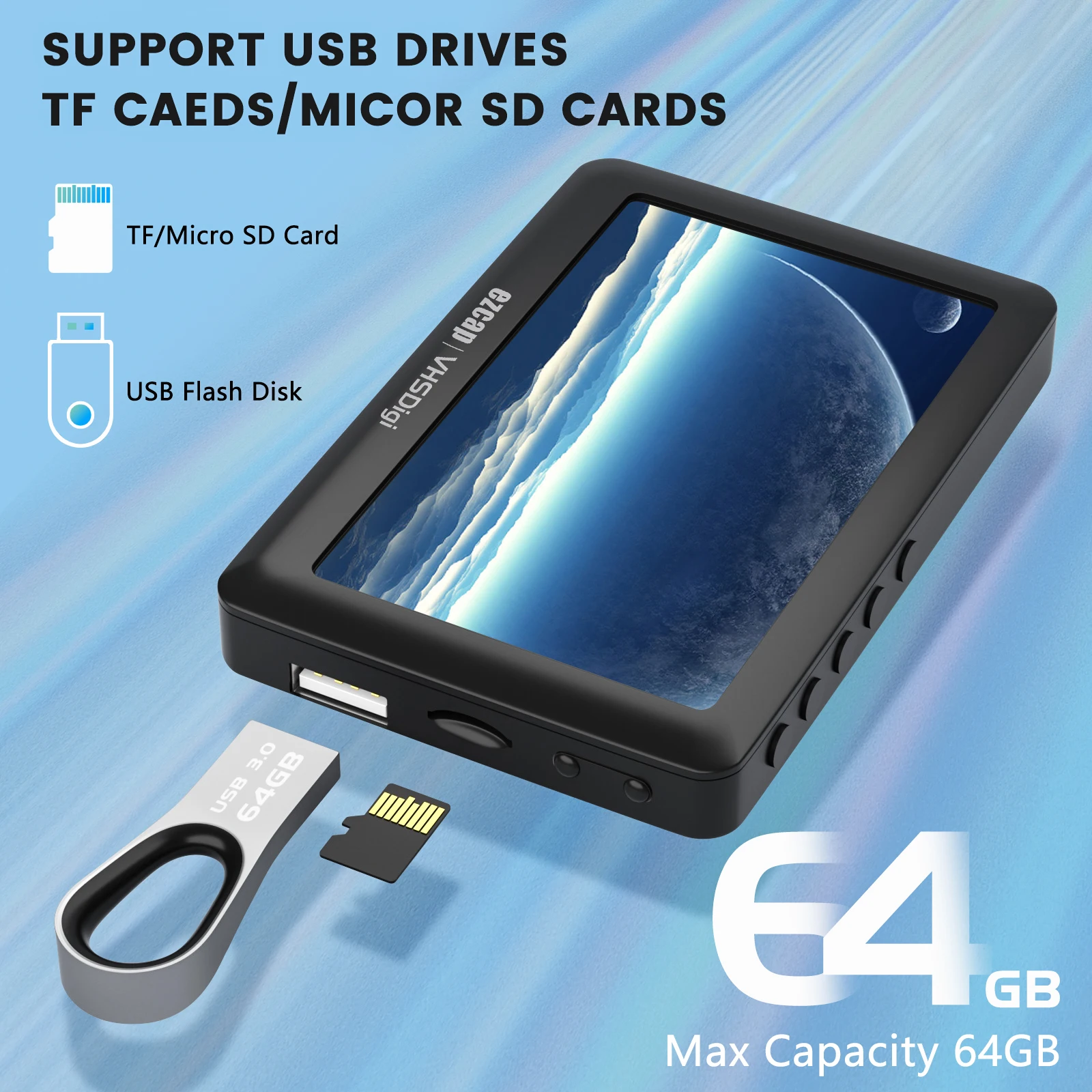 С ezcap180 VHSDigi AV Digitizer, вы можете конвертировать ваши старые видеоленты или видеокамеры в цифровой формат одним нажатием кнопки, записывать и цифровывать видео из VHS,VCR, dvd-плееров, видеорегистратор, видеокамеры, Hi8 и игровые системы. Не требуется компьютер, записывает видео напрямую. Он поддерживает Дополнительный вход для карты Micro SD и вход для флеш-накопителя USB. ezcap180 VHSDigi также может конвертировать старую музыку в цифровой формат, а также воспроизводить видео, музыку и изображения.