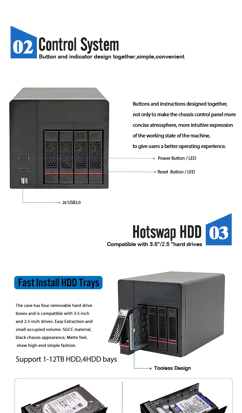 | Отсеки для хранения | 4*3,5 "/2,5" Отсеки для жесткого диска (новый дизайн инструментов) |