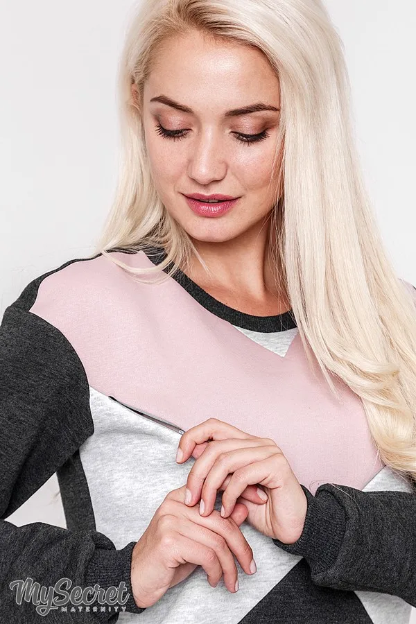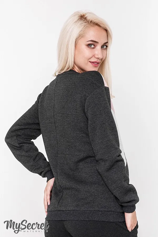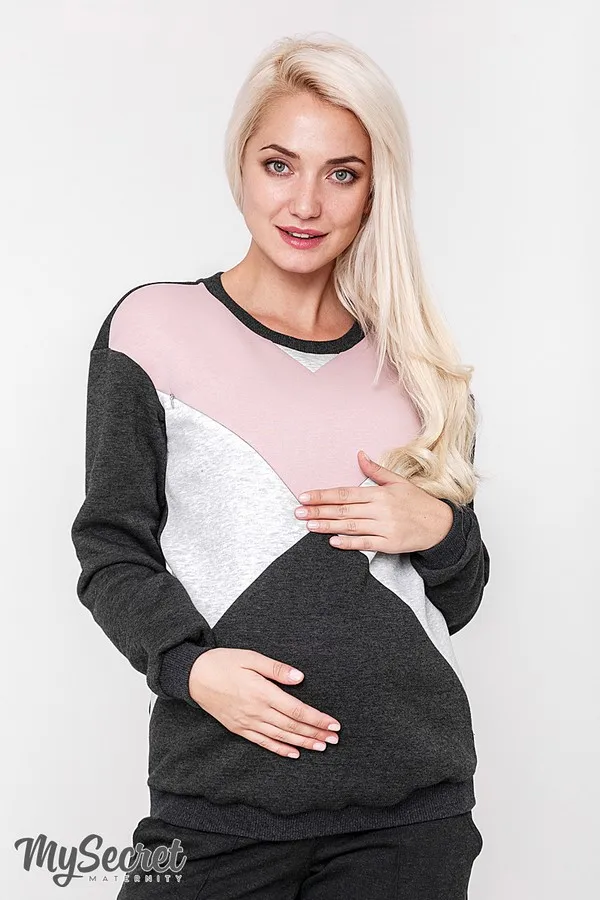 Ультрамодный теплый свитшот для беременных и кормящих из трикотажа с начесом в стиле color-block. Сочетание трёх цветов ткани так и притягивает взгляд, а секреты для кормления очень удачно замаскировались в нагрудных рельефах (незаметные потайные молнии). Состав: 70% хлопок, 30% полиэстер.