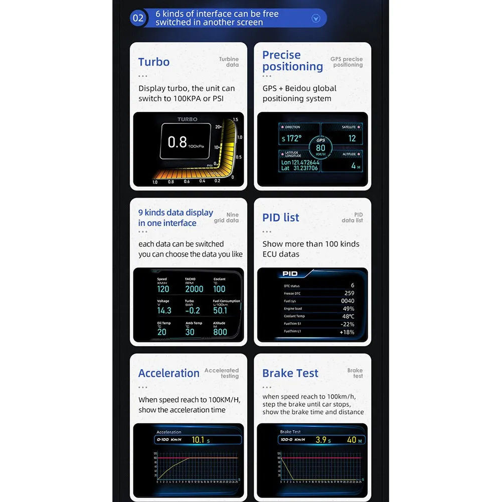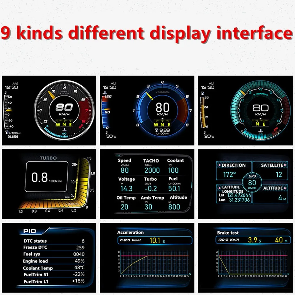 * Режим OBD2: скорость, скорость вращения, температура воды, напряжение, расход топлива, часы, одно расстояние, одно время в пути, температура масла, давление турбины, испытание на ускорение, испытание на тормоз, сверхскоростная сигнализация, сигнализация неисправности двигателя, устранение кодов неисправностей, сигнализация температуры воды, сигнализация скорости, сигнализация напряжения, Мильный переключатель, напоминание о усталости вождения, автоматическая и ручная регулировка яркости, может отображать более 100 потоков данных