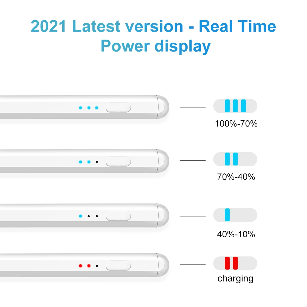 Новейший стилус 2021 Оснащен индикатором заряда батареи, который контролирует аккумулятор в режиме реального времени. Если светильник мигает, он напомнит вам о зарядке.