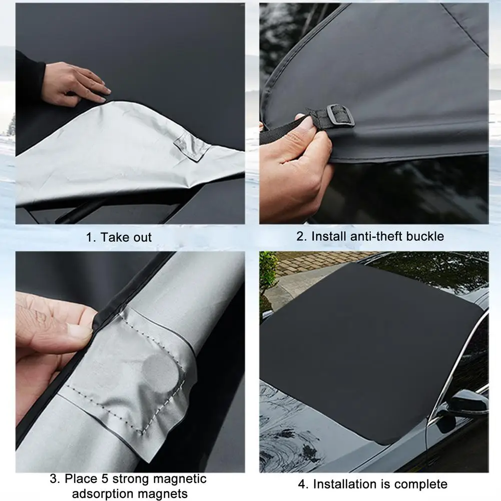 4. Простота установки: Наша крышка окна автомобиля принимает ветрозащитную пряжку и фиксированный магнит, который прост в использовании. 1. Извлеките солнцезащитный блок 2. Установите противоугонную пряжку 3. Поместите 5 сильных магнитных адсорбционных магнитов 4. Завершите установку.