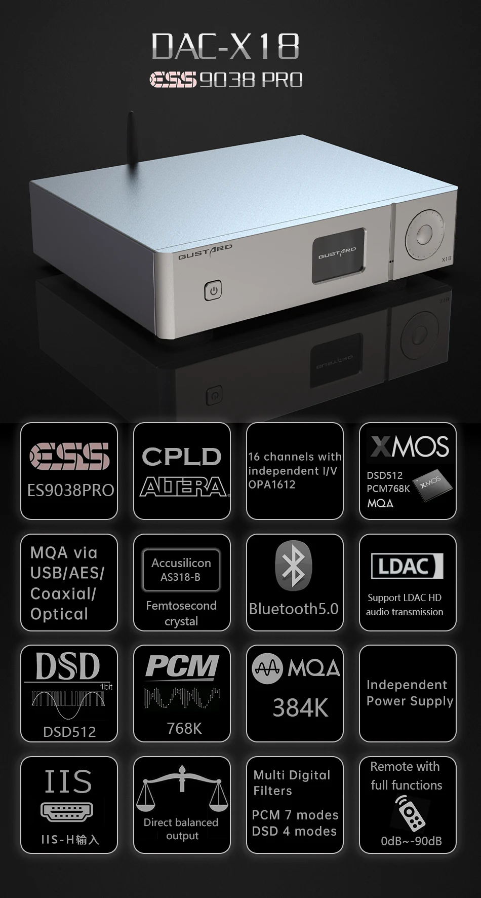 Отзывы о Декодер Gustard X18 MQA ES9038 PRO Bluetooth 5 0 XU216 процессор LDAC HD PCM768kHz DSD512