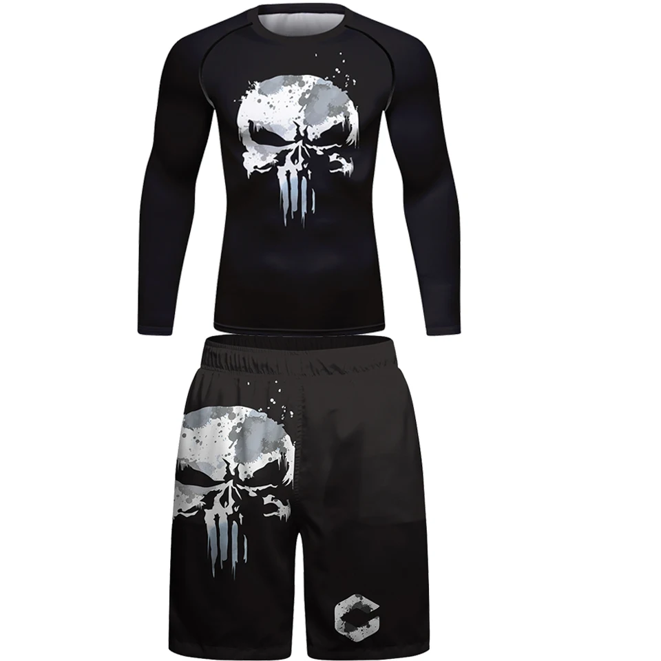 Отзывы о Футболка MMA Rashguard + шорты Muay Thai 4 шт./компл. Новые футболки Bjj с принтом в виде черепа