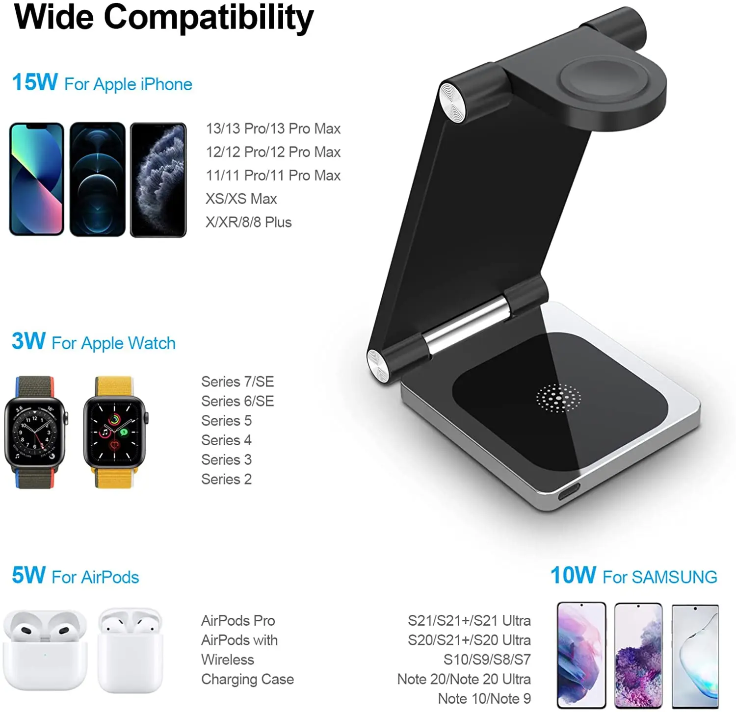 【Widely Compatibility】Быстрая 3 в 1 беспроводная зарядная подставка для iPhone 13/13 Pro/13 Pro Max/13 Mini/12/12 Pro/12 Pro Max/SE/XR/X/XS Max/11 Pro макс./11 Pro/11/8/8 Plus, samsung Galaxy ys21/S20/S10/S10 Plus/S10e/Note20/Note10/Note9/Note8 и телефоны с поддержкой Qi и т. Д. И он совместим с AirPods 3/2/Pro, Apple watch Series 7, SE, 6, 5, 4, 3, 2.(Примечание: он не подходит для Airpods без чехла для беспроводной зарядки)