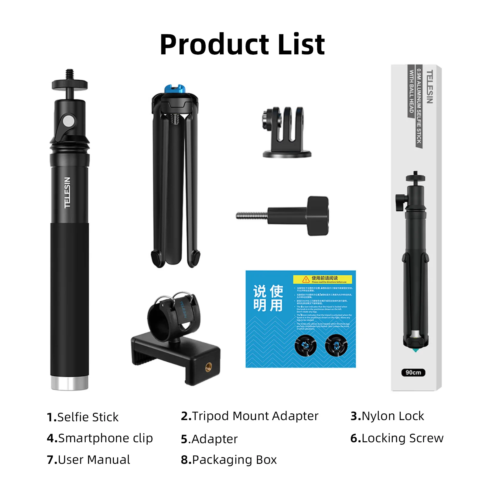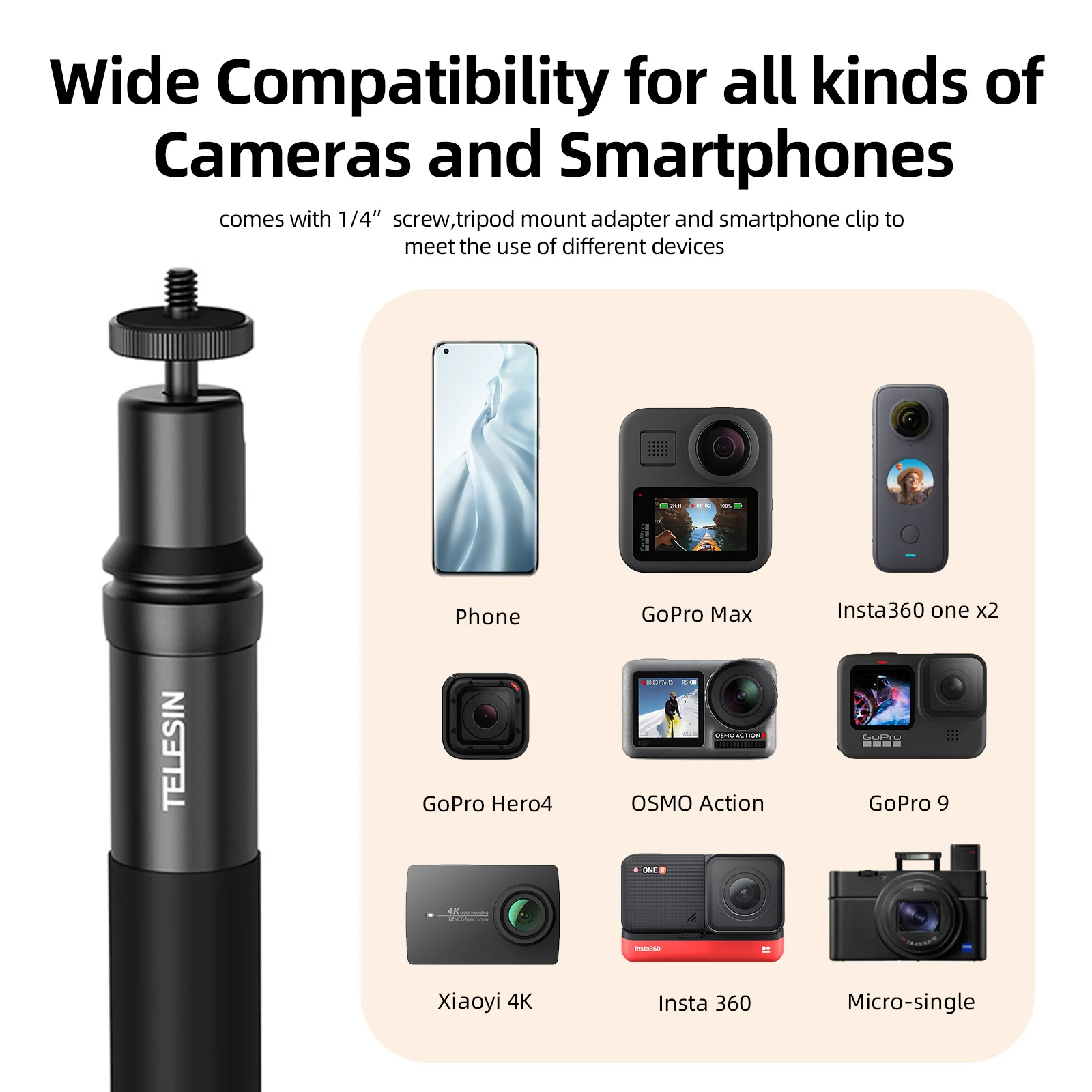 【 3 в 1 селфи-палка tripod】с модернизированным 1/4 ''винтовым адаптером и при условии, палка захвата может хорошо работать как с камерой серии Insta360, так и с камерой GoPro в качестве селфи-палки и штатива. Morever, смартфон также может быть применен с зажимом для телефона.