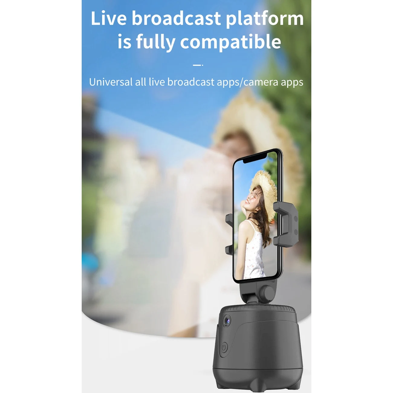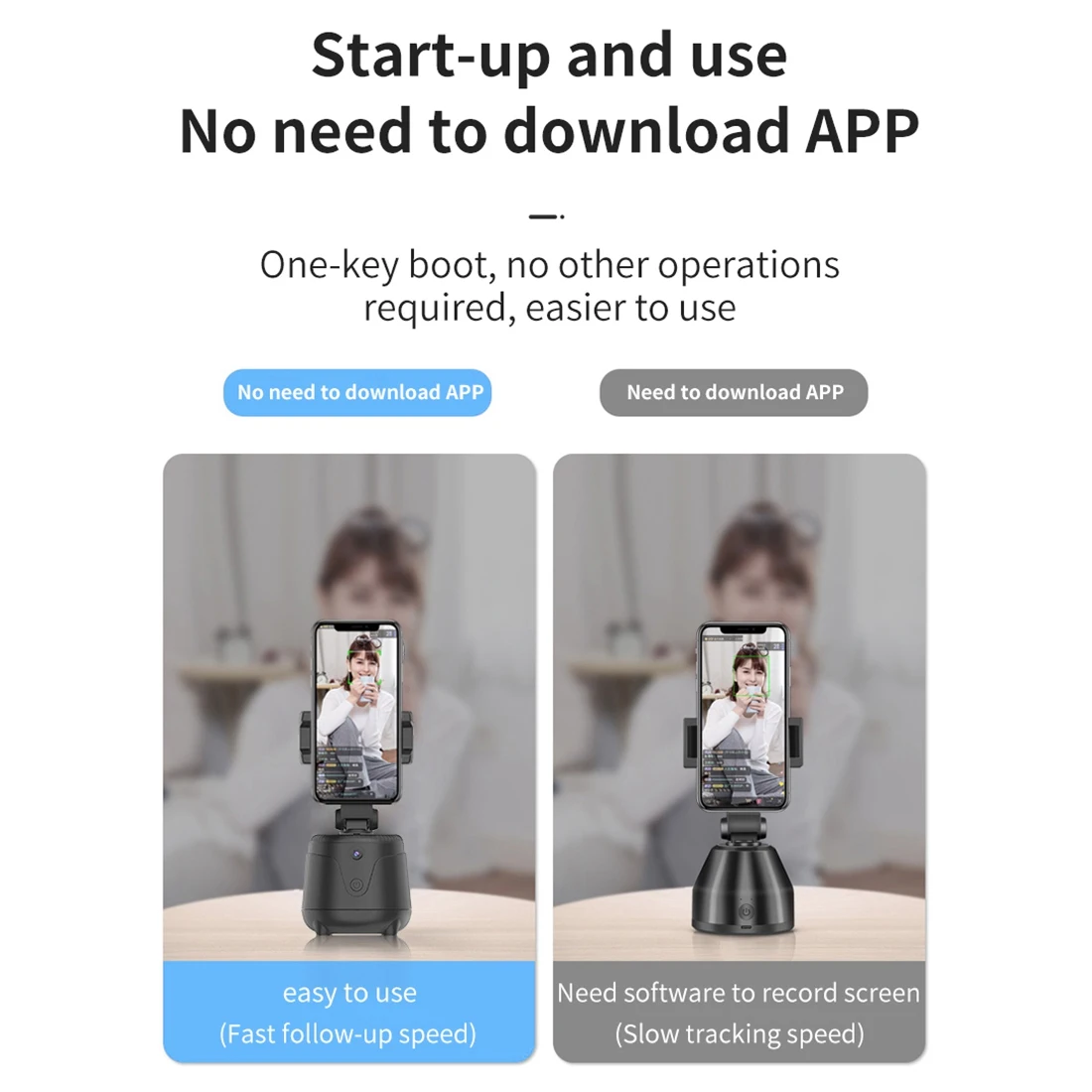 Full product features: real-time visual follow, 360-degree rotation, face follow