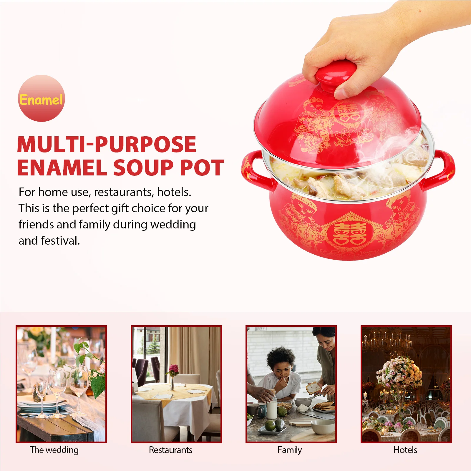 ОписаниеЭтот горшок для приготовления пищи изготовлен из высококачественных эмалевых материалов,Обеспечивает тщательное и равномерное распределение тепла. Мы так уверены, что вам понравится предоставленный нам фондовый горшок. Дизайн крышки очень прост в использовании.