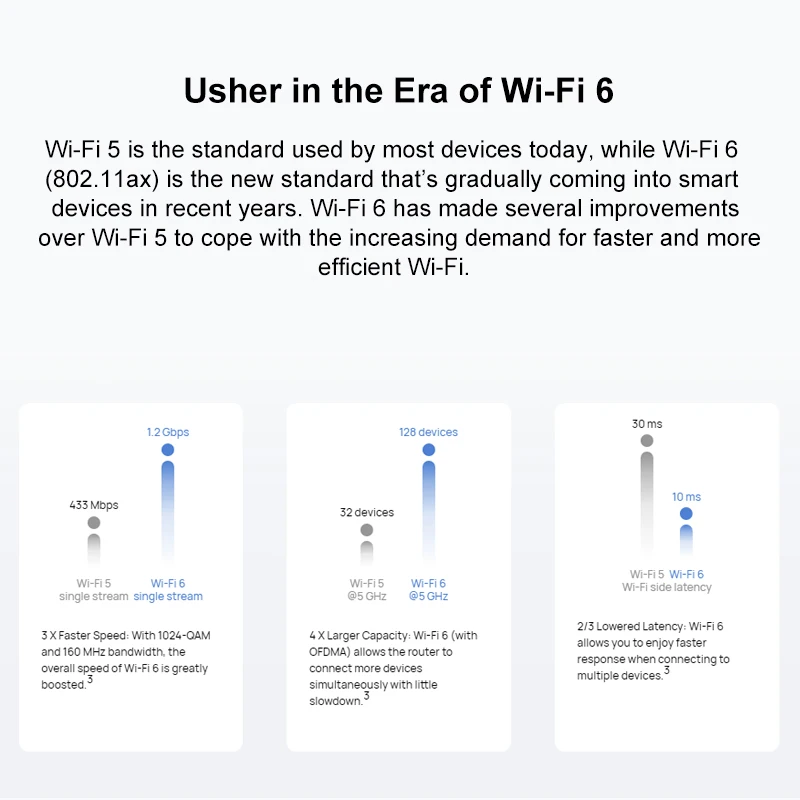 Wi-Fi 5 является стандартом, используемым большинством устройств сегодня, в то время как Wi-Fi 6(802.11ax) является новым стандартом, который постепенно переходит в смарт-устройства в последние годы. Wi-Fi 6 сделал несколько улучшений по Wi-Fi 5, чтобы справиться с растущим спросом на более быстрый и эффективный Wi-Fi.