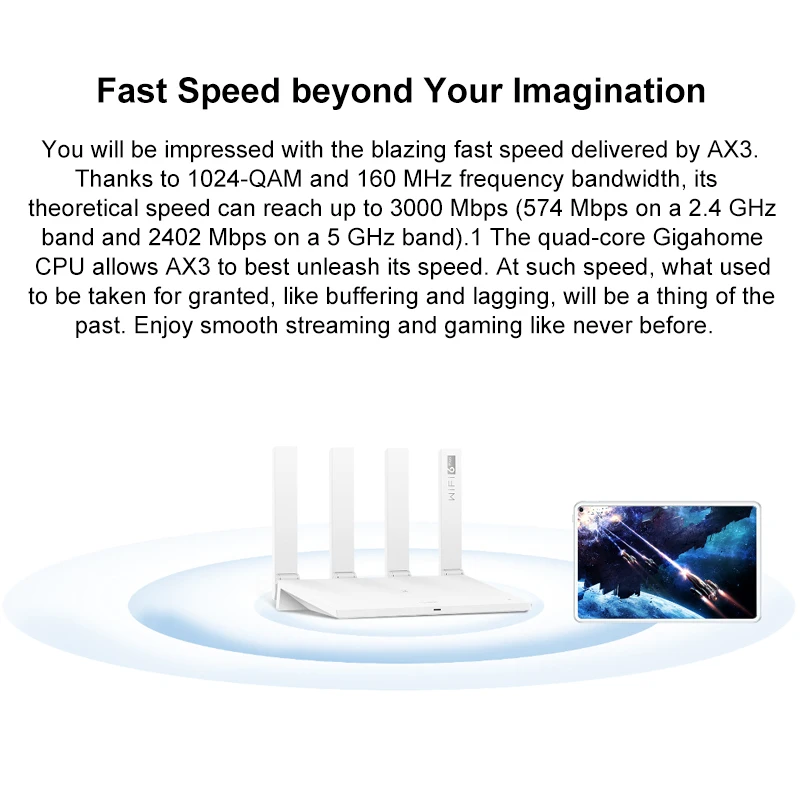 Вы будете imprtssed с bazing быстрая скорость доставки по AX3.Thanks для 1024-QAM и 160 МГц полосы частот, ее теоретические скорости может достигать до 3000 Мбит/с (574 Мбит/с на 2,4 ГГц и 2402 Мбит/с на диапазоне 5 ГГц). Четырехъядерный процессор Gigaphome позволяет AX3 наилучшим образом раскрыть свою скорость. На такой скорости то, что раньше было принято как само собой разумеется. Как буферизация и отставание, будет вещью прошлого. Наслаждайтесь плавной потоковой передачей и играми, как никогда раньше.