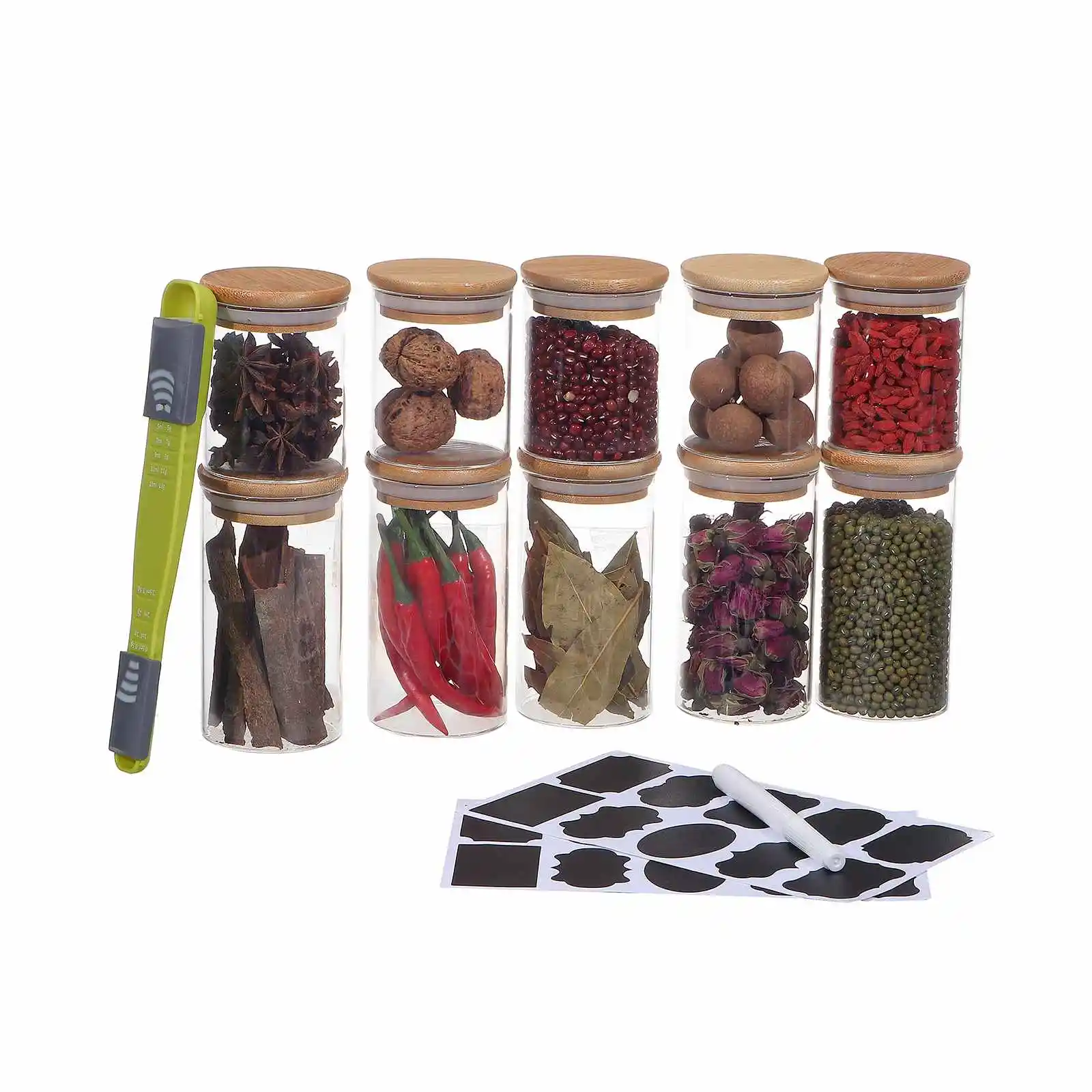 1. Этот набор банок для хранения пищевых продуктов поставляется с 10 маленькими стеклянными баночками для хранения в 2 различных размерах, таких как Емкость: 5x350 мл, 5x250 мл. Он может удовлетворить различные потребности в хранении. Более того, в комплект входит ручка, черная наклейка, которую можно использовать повторно, и мерная ложка с точной шкалой. Вы можете маркировать ваш контейнер для еды в любое время.