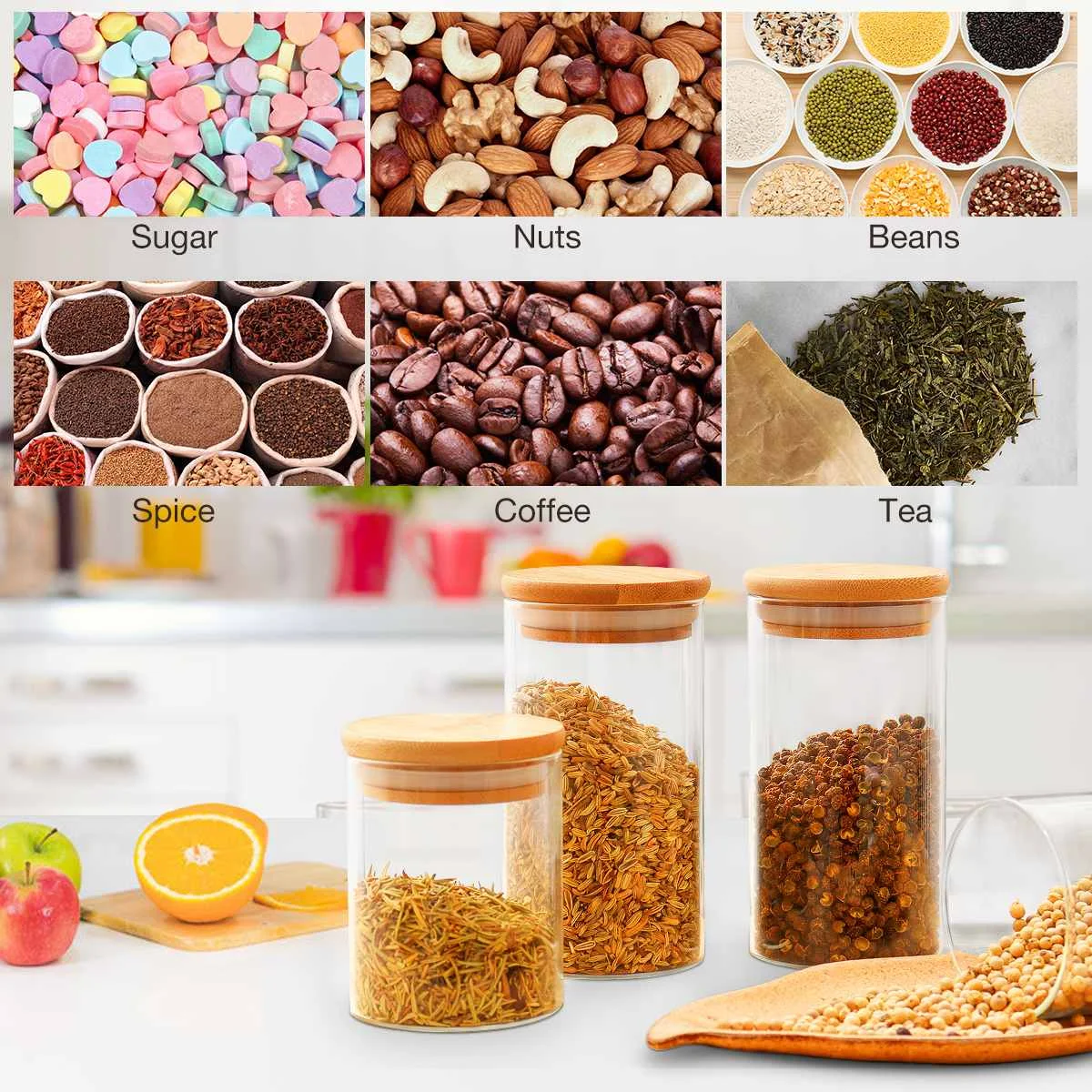 2. Боросиликатное стекло: прозрачные герметичные контейнеры для хранения изготовлены из высококачественного боросиликатного стекла, более светлого и термостойкого, чем обычные стеклянные горшки, и могут выдерживать температуры от-20 до 150 градусов. Вы можете положить его в холодильник и микроволновую печь или даже положить в посудомоечную машину для очистки. (Примечание: Бамбуковая крышка не может быть очищена в посудомоечной машине)
