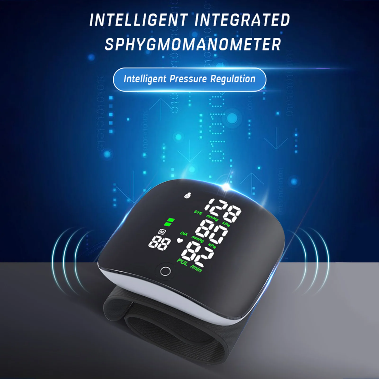 Монитор кровяного давления-дизайн контактного экрана, трехцветный дисплей, измерение запястья. Он поддерживает записи памяти двух человек, 99 групп значений памяти можно хранить, голосовые подсказки дружественны для пожилых людей.