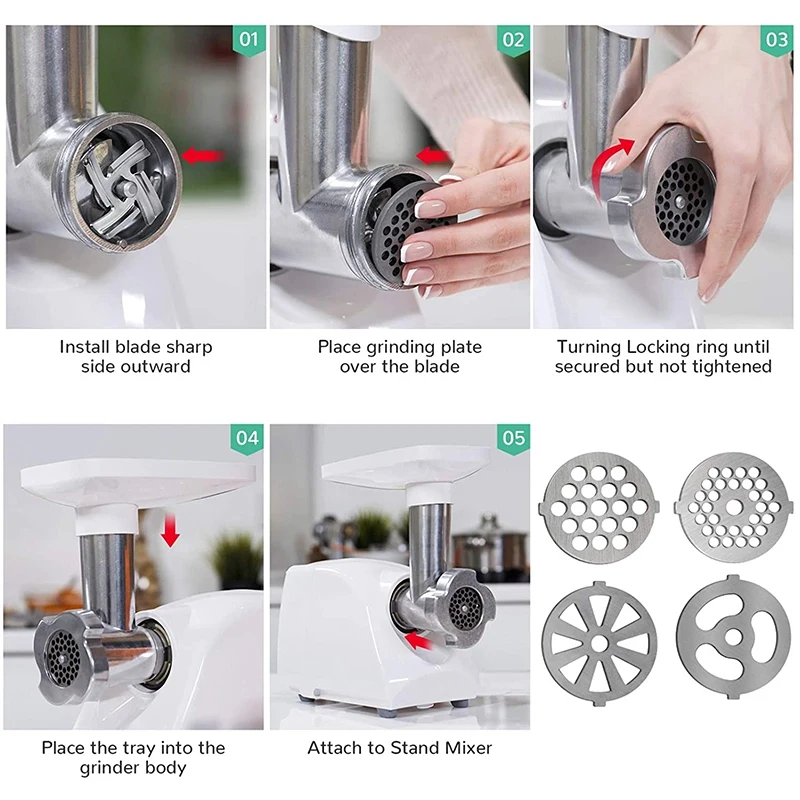 5 дисков для мясорубки в 5 различных стилях, 4 лезвия для мясорубки в 2 различных формах, держатель для колбасы. Аксессуары для мясорубки подходят практически всем размерам 55 мм мясорубки и мясорубки, центральное отверстие 7 мм, подходит для размера 5 миксер и Мясорубка. И держатель колбасы может предотвратить блокировку машины.