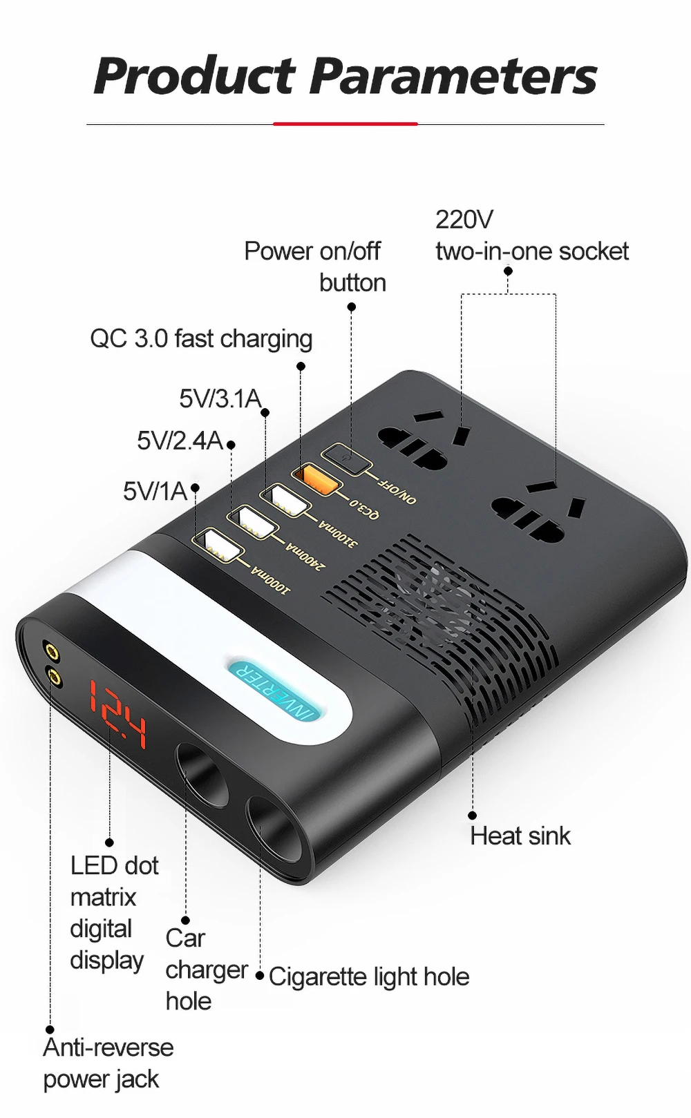 1. Автомобильный многофункциональный преобразователь, 12 В/24 В до 220 В инвертор
