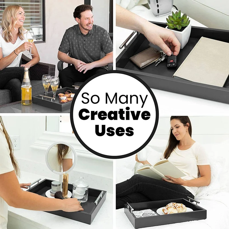 Уникальный дизайн-вы знаете, что декоративные подносы являются одним из самых любимых предметов домашнего декора от дизайнеров интерьера? Есть бесконечные возможности стилизовать и украсить свой дом лотками. Этот черный декоративный поднос имеет полированные серебристые металлические ручки и соответствующие серебряные линии ручной работы на дне лотка. В этом лотке есть что-то очень простое и аккуратное, что делает его визуально привлекательным для глаз.