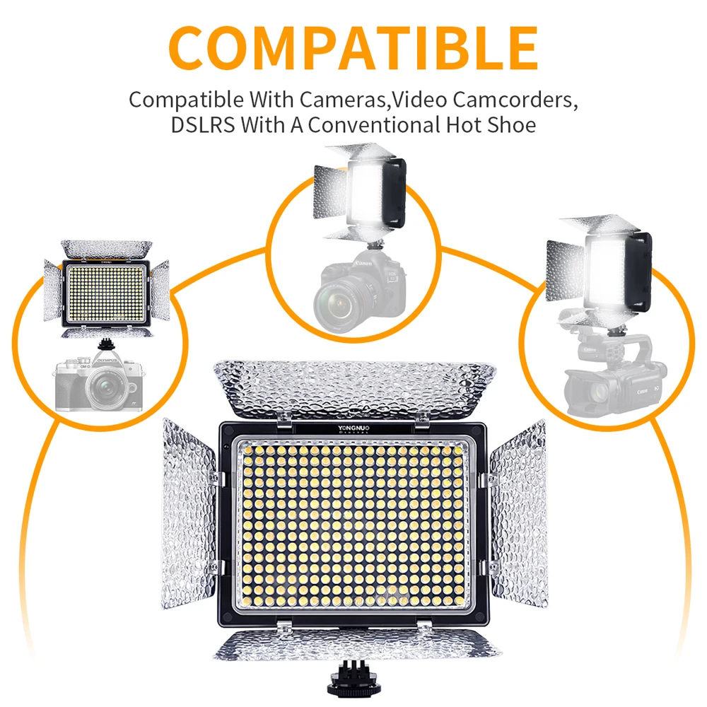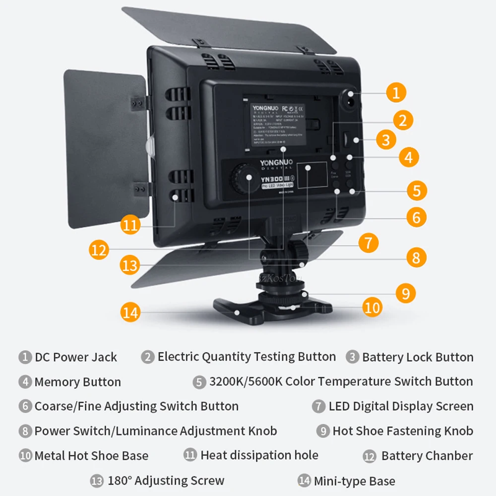 3. YN300 III состоит из 150 светодиодный ламповых бусин с цветовой температурой 3200K и еще 150 светодиодный ламповых бусин с цветовой температурой 5500K, которые являются высококачественными ламповыми бусинами сверхбольших светящихся чипов, С более высокой яркостью в одинаковом энергопотреблении. Цветовая температура может быть скорректирована с 3200-5500K по мере необходимости, с более практичным использованием.