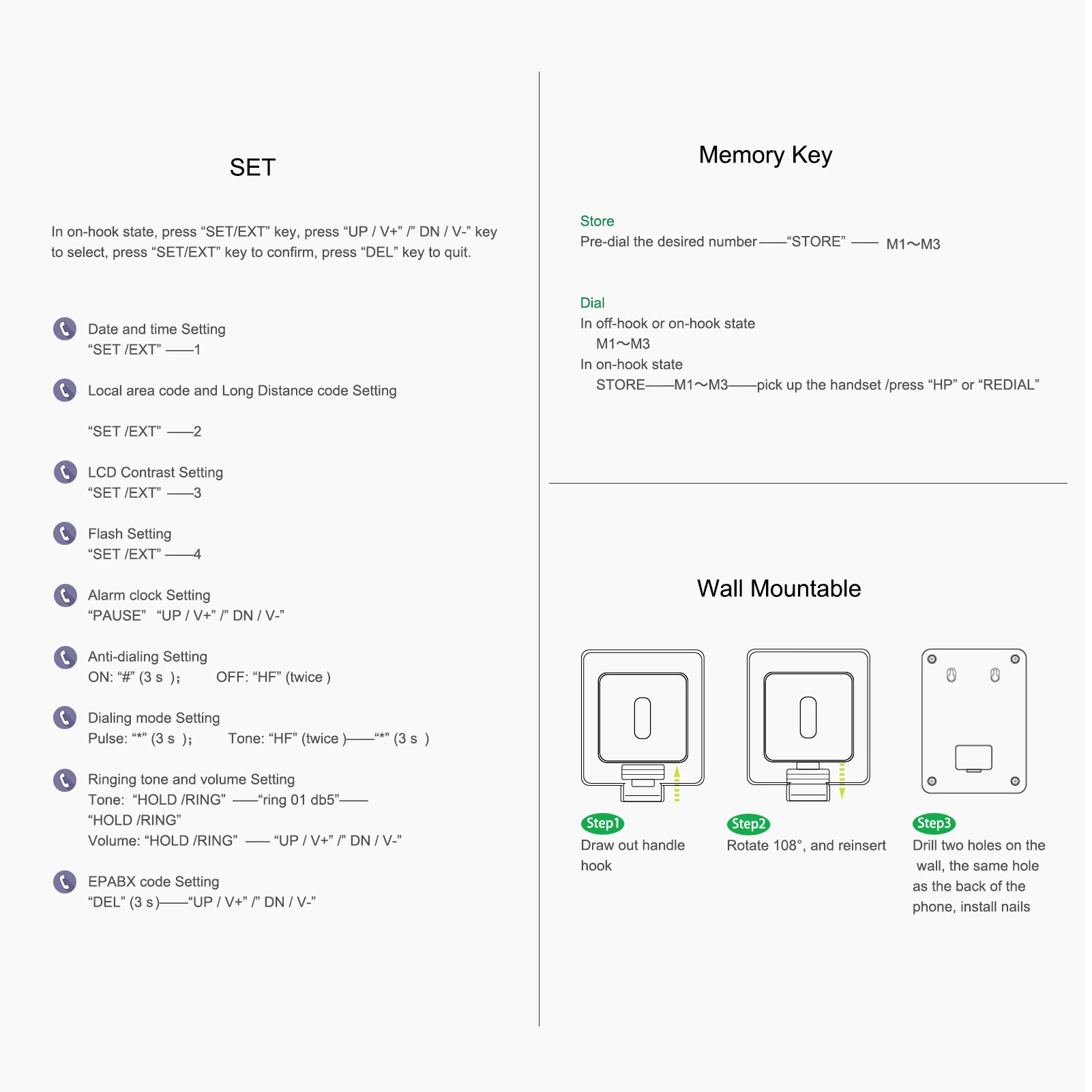 Характеристики:<;br/>DTMF/FSK совместимый Настольный стационарный телефон с P/T переключателем и режимом без помех подходит для дома, гостиницы, офиса, колл-центра и т. д. <;br/> поддерживает отключение звука, функция flash, redial, pause, hands free, hold, back dial, anti-stealing dialing. 99 входящих вызовов памяти и 18 исходящих вызовов памяти.<;br/> Кнопки телефона ясны. Поставляется с 3 кнопками памяти с одним касанием, функцией повторного набора и функцией паузы. Более того, можно регулировать громкость кольца и громкость динамика и 5 видов мелодий звонка для выбора.<;br/>16 цифр ЖК-дисплей с синей подсветкой, пожалуйста, установите 3 батарей типа AA (не входят в комплект) перед использованием. 16 уровень яркости регулируется.<;br/> задняя часть телефона с 2 отверстиями для настенного крепления, который может положить его на стол или установить на стену.<;br/> Спецификация:<;br/> Модель: M64<;br/> Цвет: черный <;br/> Материал: ABS<;br/> Батарея: 3 х АА Батарея шт.) (не входят в комплект поставки)<;br/> продукт Размеры: 20x14,7x6 см/7,9x5,8 x 2.4in<;br/> посылка Размеры: 21,5x19,5x5,8 см/8,9x7,7 x 2.6in<;br/> посылка Вес: 646g/22,8 oz<;br/> Упаковочный лист:<;br/>1 x трубка <;br/>1 x телефонная база <;br/>1 x шнур катушки <;br/>1 x телефонный кабель <;br/>1 x Руководство пользователя <;br/>1) Мы принимаем Alipay, West Union, TT. Все основные кредитные карты принимаются через безопасный платежный процессор ESCROW.<;br/>2) оплата должна быть произведена в течение 3 дней с момента заказа. <;br/>3) Если вы не можете проверить сразу после закрытия аукциона, пожалуйста, подождите несколько минут и повторите попытку, оплата должна быть завершена в течение 3 дней. <;br/>1. Доставка по всему миру. (За исключением некоторых стран и APO/FPO)<;br/>2. Заказы обрабатываются своевременно после подтверждения оплаты.<;br/>3. При заказе мы грузим только на подтвержденные адреса. Ваш адрес заказа должен совпадать с вашим адресом доставки.<;br/>4. Представленные изображения не являются фактическим товаром и предназначены только для справки.<;br/>5. Время доставки устанавливается перевозчиком без учета выходных и праздничных дней. Время доставки может меняться, особенно во время праздничного сезона.<;br/>6. Если вы не получили ваш заказ в течение 30 дней со дня платежа, пожалуйста, свяжитесь с нами. Мы отследим отправку и свяжемся с вами как можно скорее. Наша цель-удовлетворенность клиентов!<;br/>7. Из-за наличия на складе и разницы во времени, мы выберем доставку Вашего товара с нашего первого доступного склада для быстрой доставки.<;br/>8. Время доставки:<;br/>1. У вас есть 7 дней, чтобы связаться с нами и 30 дней, чтобы вернуть его с даты получения. Если данный товар находится в вашем распоряжении более 7 дней, он считается пользованным товаром и МЫ НЕ ПРОИЗВОДИМ ВОЗВРАТ ИЛИ ЗАМЕНУ. Исключений нет! Стоимость доставки оплачивается как продавцом, так и покупателем пополам.<;br/>2. Все возвращенные товары должны быть в оригинальной упаковке, и вы должны предоставить нам номер отслеживания доставки, конкретную причину возврата и ваш po #.<;br/>3. Мы вернем вам ПОЛНУЮ СУММУ ПЛАТЕЖА по получении товара в первоначальном состоянии, в оригинальной упаковке и со всеми компонентами и аксессуарами после того, как ОБЕ СТОРОНЫ, Покупатель и Продавец, отменят сделку на AliExpress. Или вы можете выбрать замену.<;br/>4. Мы будем нести все расходы по доставке, если товар (ы) является (являются) не как рекламируется.<;br/>1. 12 месяцев ограниченной гарантии производителя на дефе
