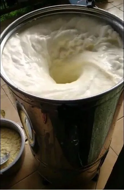 -После того, как машина работает 20 минут, пена, то есть масло накапливается на поте, вы можете взять эту пену с ложкой или напрячь ее, проливая ее в большое ведро с марлей, и если вы хотите, вы можете сделать оставшуюся масляную маску, Это тип сыра.