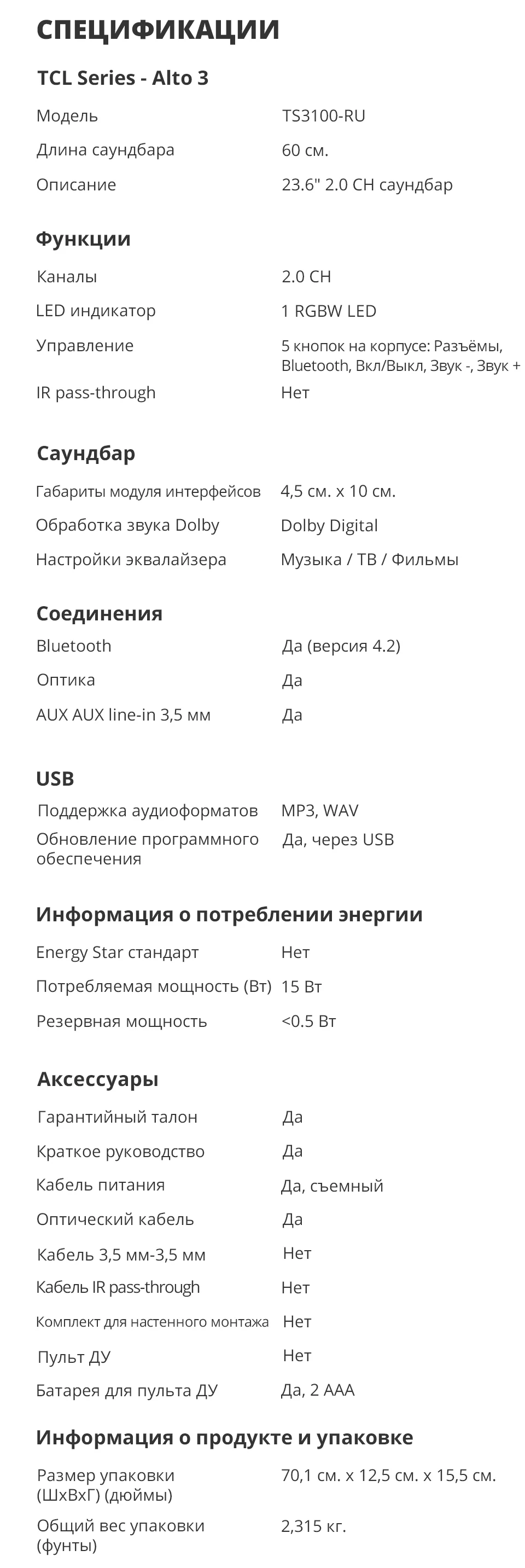 Отзывы о Беспроводная звуковая панель TCL TS3100 для домашнего кинотеатра соединение Bluetooth