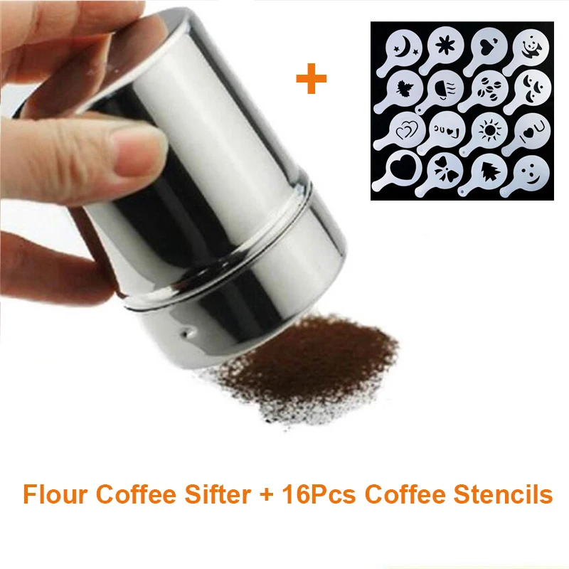 1 шт. шейкер для кофе и шоколада из нержавеющей стали сито для мучной кофе какао + 16 шт. трафареты для кофе шаблон Strew Pad инструменты для распыления пыли