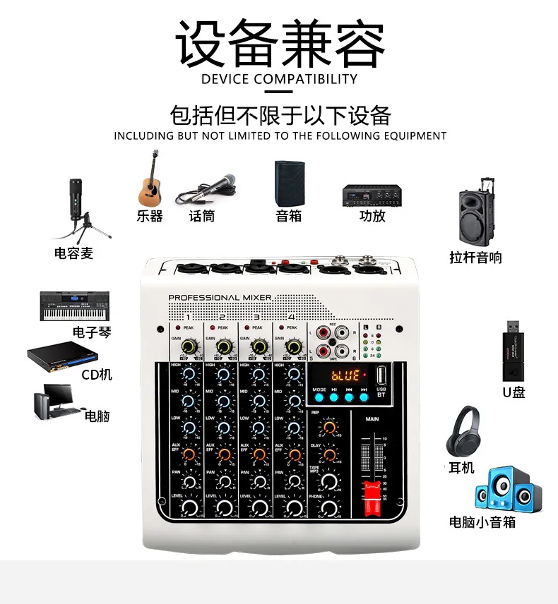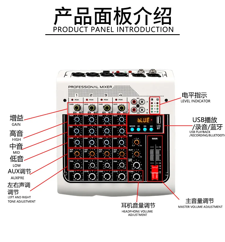 С усилением, высокими, средними, низкими, поворотными и уровневыми ручками для легкого раздельного управления, питание от источника питания DC5V USB или адаптера питания.