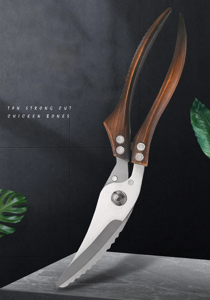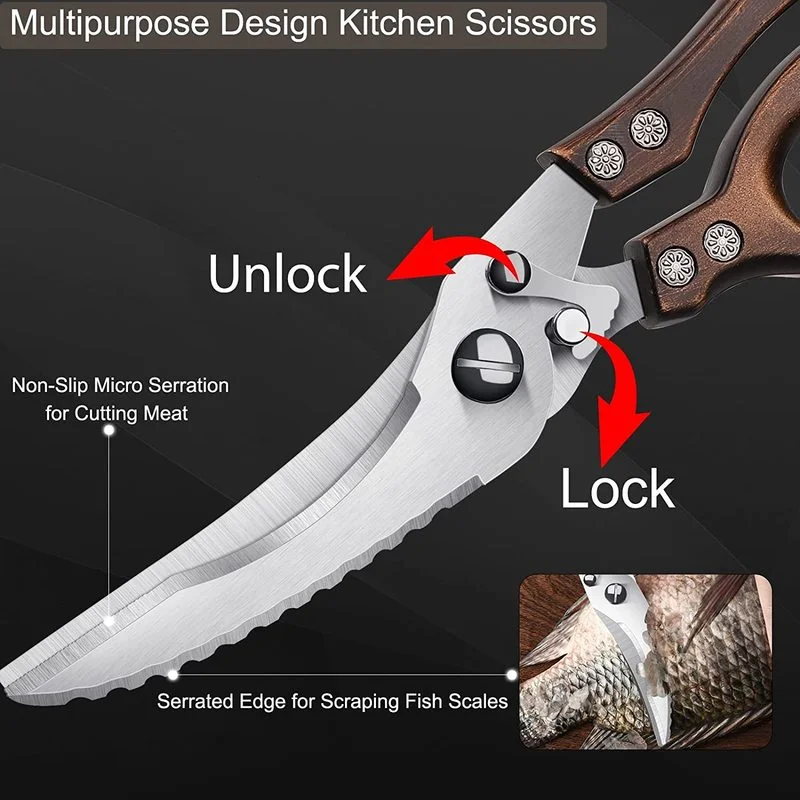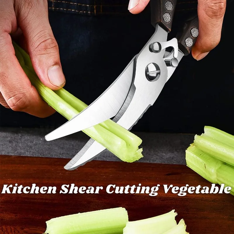[Ножницы для птицы из высококачественной нержавеющей стали] ножницы для кухни для птицы изготовлены из высококачественной нержавеющей стали, которая более точна и толще. Лезвия профессиональных птиценожниц очень острые, а зубчатое лезвие является идеальным инструментом для соскабливания рыбных весов. Кухонные ножницы могут легко резать куриные крылышки, рыбу, мясо и овощи и играть важную роль на кухне.