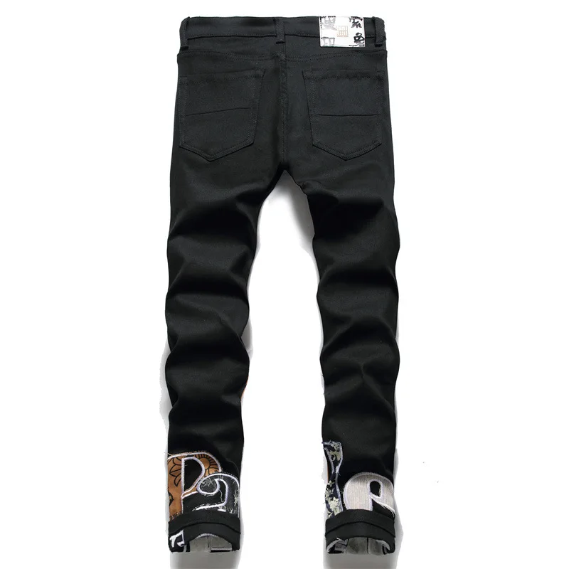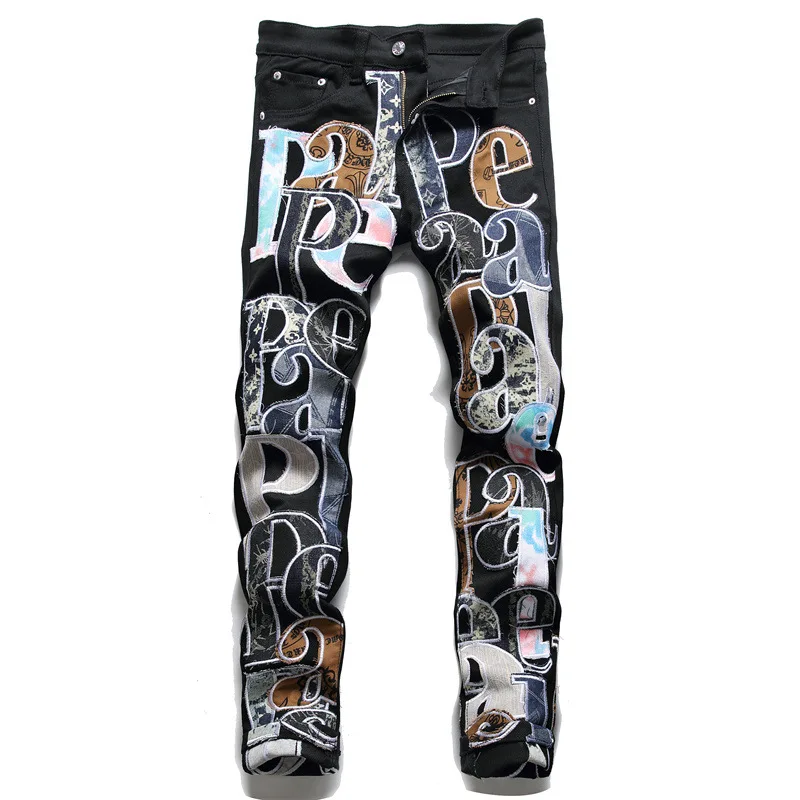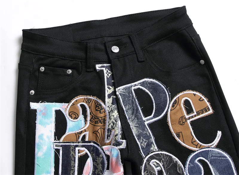 Мужские облегающие джинсы с вышитыми буквами, потертые джинсы, модные Стрейчевые хлопковые уличные повседневные брюки в стиле хип-хоп