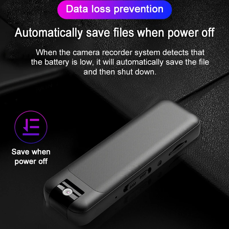 Когда система записи камеры обнаруживает, что батарея низкая, она автоматически сохранит файл, а затем выключится.