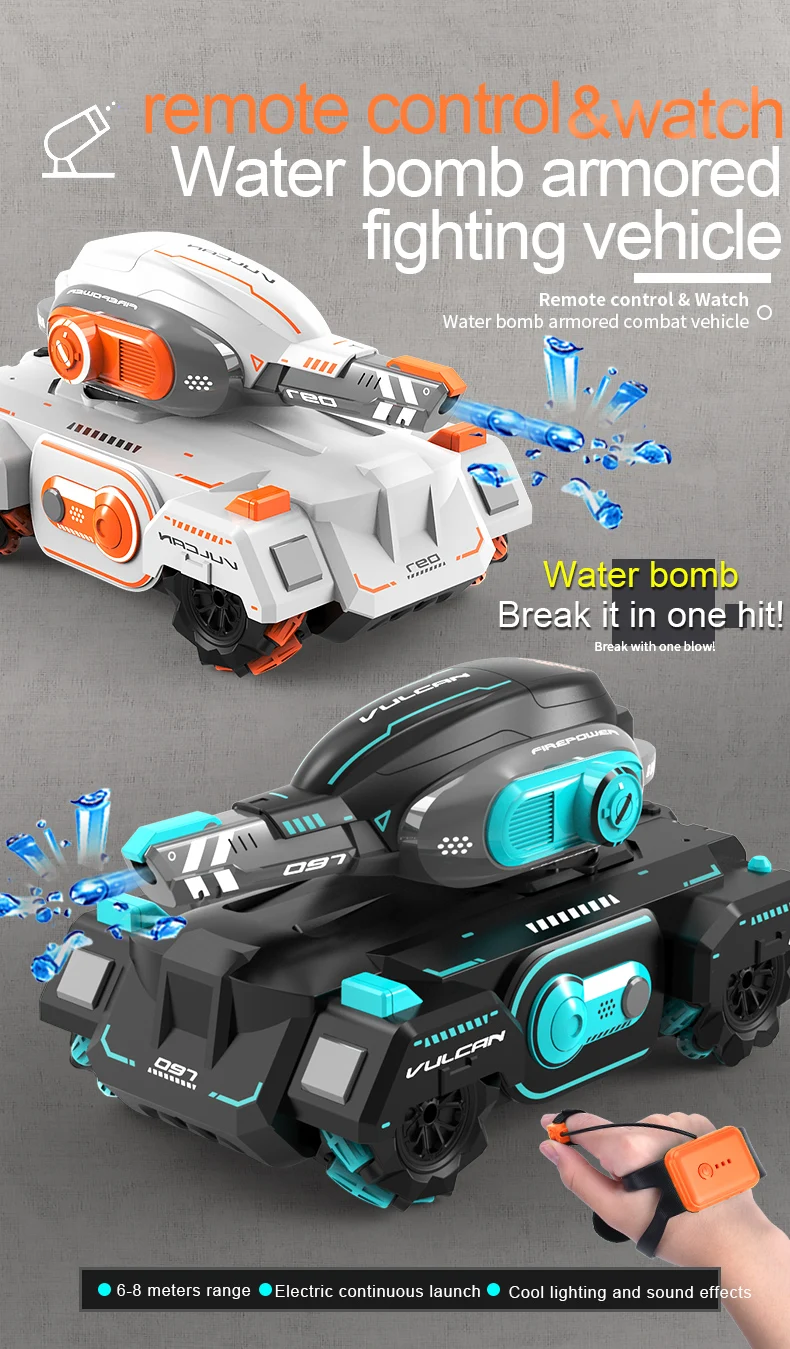 -Can launch water bombs, dual remote control, non-slip Mecanum tires, forward, reverse, turn left and right, move left and right, 6-8 meters water bomb range, light music, automatic demonstration packing list