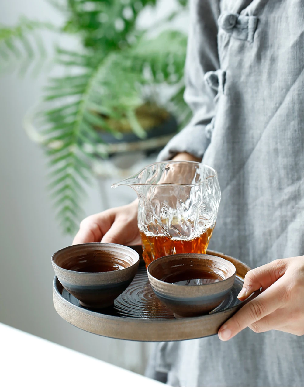 ANDREWLEE Ceramic Round Tea Tray Handmade Pottery Pot Holder Retro Water Storage Tea Tray Tea Accessories