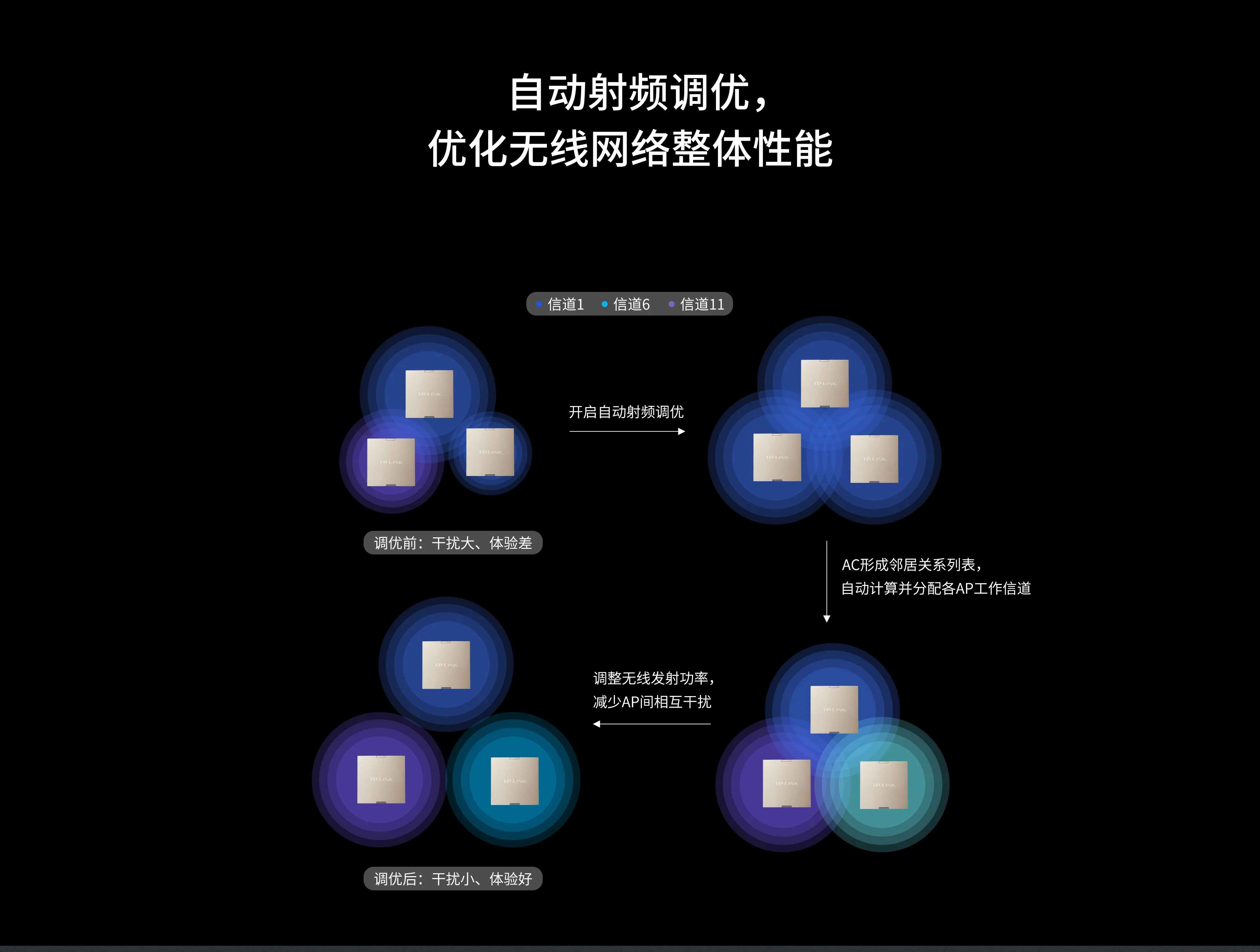 > Автоматическая Настройка радиочастот, оптимизирует общую производительность беспроводной сети. Поддерживает автоматическую настройку радиочастот, автоматически вычисляет связь между AP в сети, И автоматически Отрегулируйте мощность беспроводной передачи и канал в соответствии с помехами в режиме реального времени и условиями нагрузки на соседние устройства, чтобы гарантировать, что общая беспроводная сеть всегда на высокой скорости, высокопроизводительное рабочее состояние.
