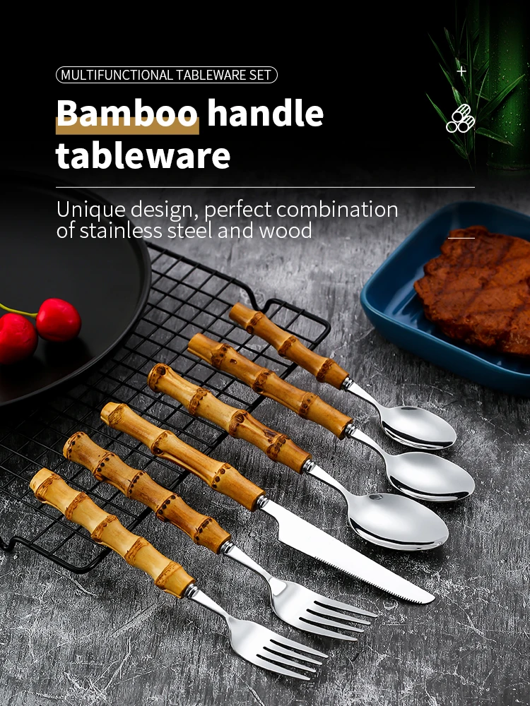 <Ретро набор столовых приборов из нержавеющей стали оснащен ручными бамбуковыми ручками